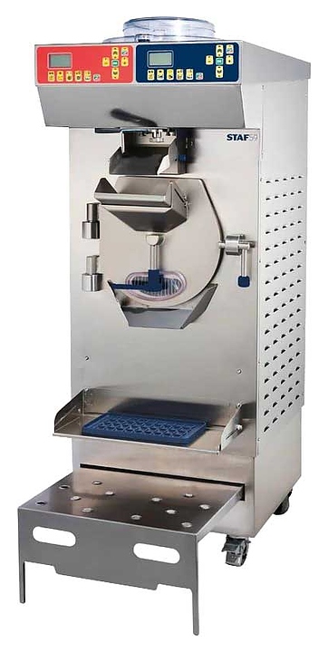 Фризер-пастеризатор STAF59 RHB15/100 W используется для приготовления мороженого, кондитерских кремов и джемов на предприятияx общественного питания и торговли. Пастеризация снижает бактериальную обсемененность сырья и свежих полуфабрикатов без ухудшения органолептических и питательных свойств продуктов. Модель состоит из 2 раздельных независимых резервуаров, каждый из которых оснащен компрессором и инвертором, что обеспечивает непрерывный производственный цикл без простоев. Верхний резервуар предназначен для термического/пастеризационного процесса, нижний - для заморозки партии. Перемещение смеси из верхнего бака в нижний возможно благодаря внешнему каналу. Корпус, дверь нижнего бака и мешалки выполнены из нержавеющей стали, скребки нижнего бака - из полиоксиметилена, скребки верхнего бака - из полиэтилена.