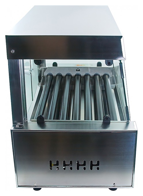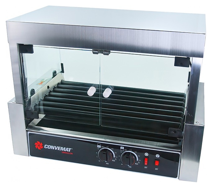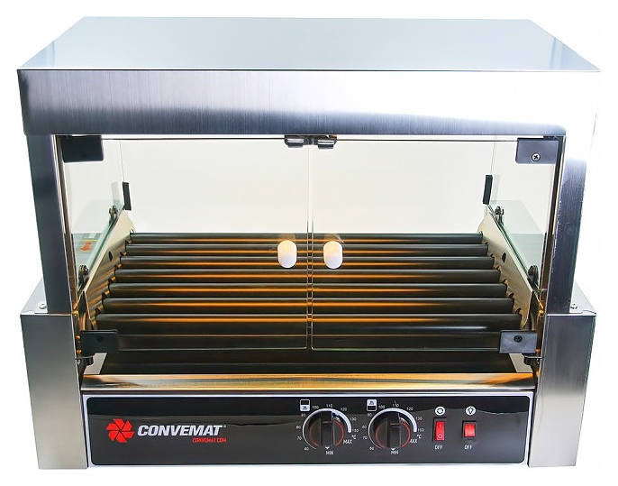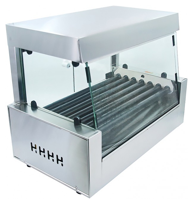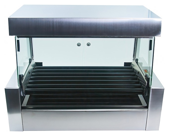 Роликовый гриль CONVEMAT 000.ROE-7/58.2S.1.TC используется для обжаривания и подогрева сосисок и колбасок для хот-догов на предприятиях общественного питания, фуд-кортах и торговых точках по продаже гриль-догов. Модель оснащена роликами с антипригарным тефлоновым покрытием, выдвигающимся лотком, защитным экраном, подсветкой рабочей площади, 2 независимыми зонами нагрева и плавной регулировкой температуры. Боковые ограничители с механической фиксацией защищают от стекания жира по внутренним бортам. Легкий наклон рабочей поверхности в сторону покупателя обеспечивают лучшую презентацию и обзор продукта. Корпус выполнен из нержавеющей стали, экран - из стекла. Дополнительные характеристики: