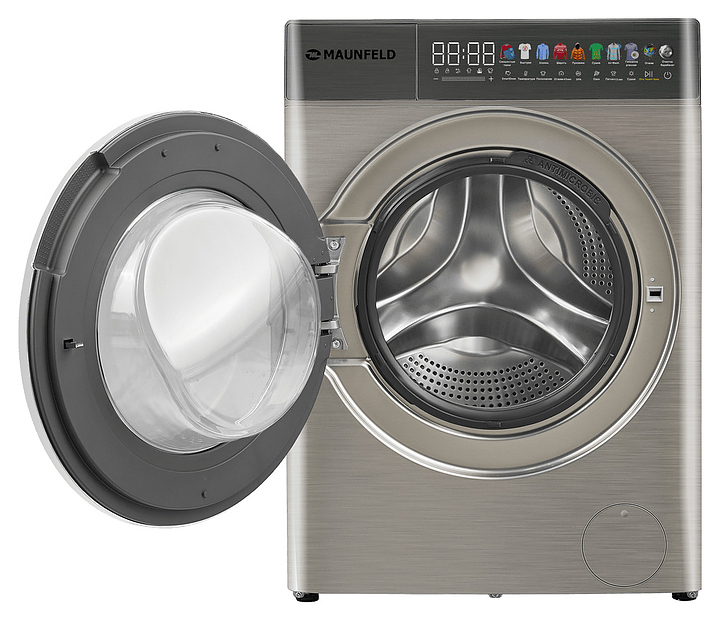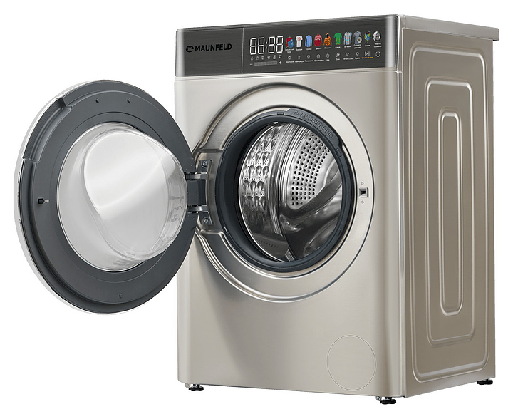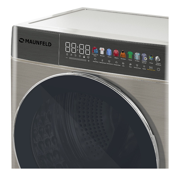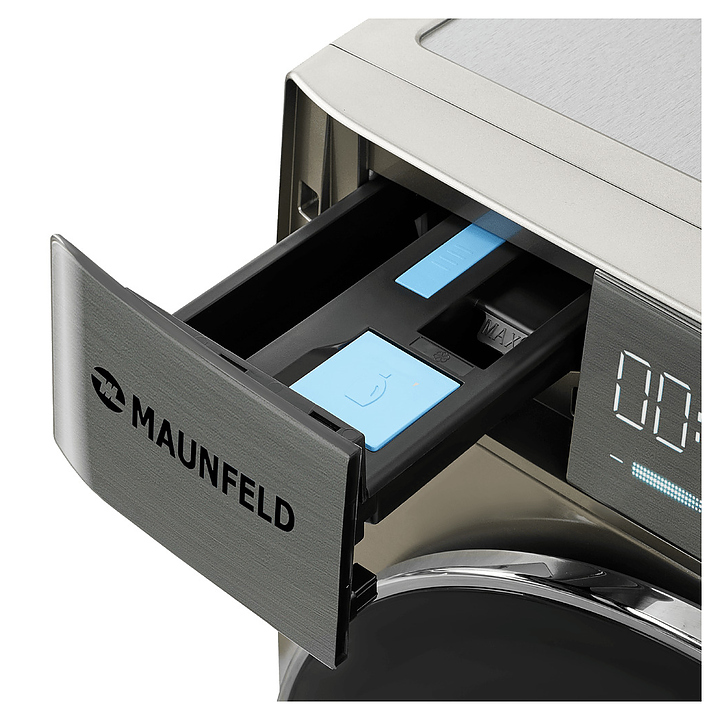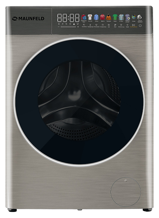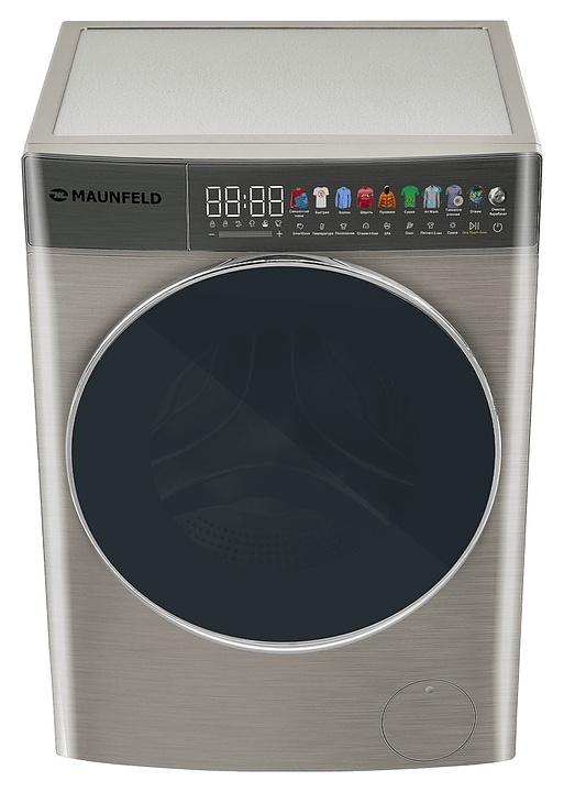 Стирально-сушильная машина Maunfeld MFWD14116S05используется в домашних условиях, а также небольших прачечных для стирки, полоскания, отжима и сушки белья, одежды и тканей. Модель оснащена фронтальным загрузочным люком, левосторонней дверью люка со смотровым окном, кабелем питания с вилкой, съемным лотком для моющих средств, сенсорной панелью управления с функциональными клавишами, цветными иконками программ, светодиодными цифровым дисплеем, индикаторами с текстовыми и символьными сегментами с белой подсветкой. Корпус выполнен из металла с антикоррозийным покрытием под нержавеющую сталь темно-серебристого оттенка, крышка двери люка – из прозрачного стекла с черной окантовкой, внешняя крышка двери люка – из стекла с полупрозрачной дымчатой тонировкой и декоративной окантовкой серебристого оттенка, барабан – из высококачественной нержавеющей стали, верхние фронтальные панели с темно-серой глянцевой поверхностью.