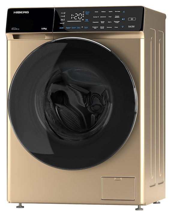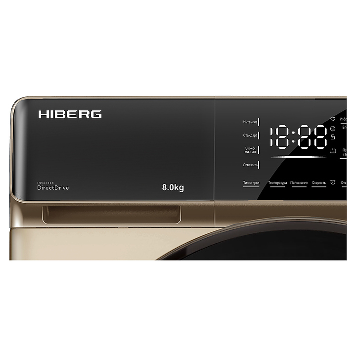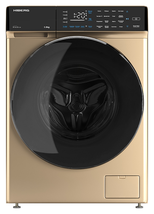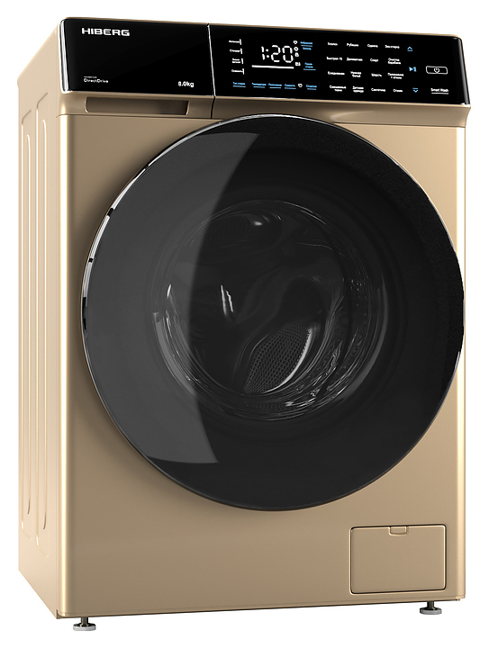 Стиральная машина Hiberg i-DDQ9 - 812 G используется в домашних условиях, а также небольших прачечных для стирки, полоскания и отжима белья, одежды и тканей. Модель оснащена фронтальным загрузочным люком, левосторонней дверью люка со смотровым окном, кабелем питания с вилкой, съемным лотком с 3 отсеками для моющих средств, сенсорной панелью управления с функциональными клавишами, светодиодными цифровым дисплеем и сигнальными индикаторами с символьными и текстовыми сегментами с белой подсветкой. Корпус выполнен из металла с антикоррозийным покрытием золотистого оттенка, крышка двери люка – из прозрачного стекла с черной широкой окантовкой, внешняя крышка двери люка – из стекла с полупрозрачной черной тонировкой и глянцевой окантовкой черного цвета, барабан – из высококачественной нержавеющей стали, верхние фронтальные панели с черной глянцевой поверхностью.