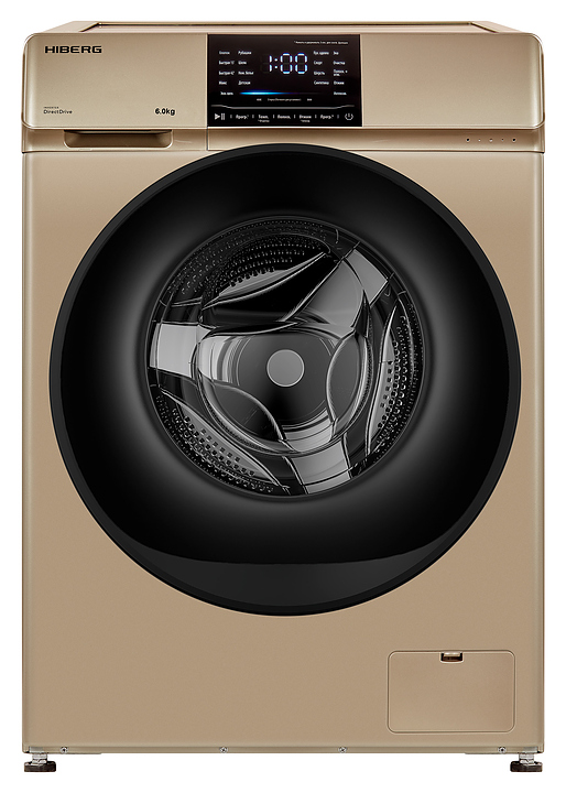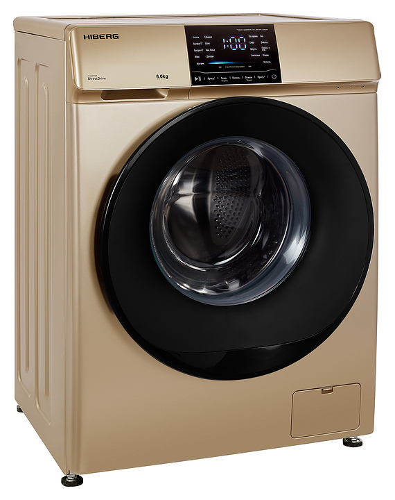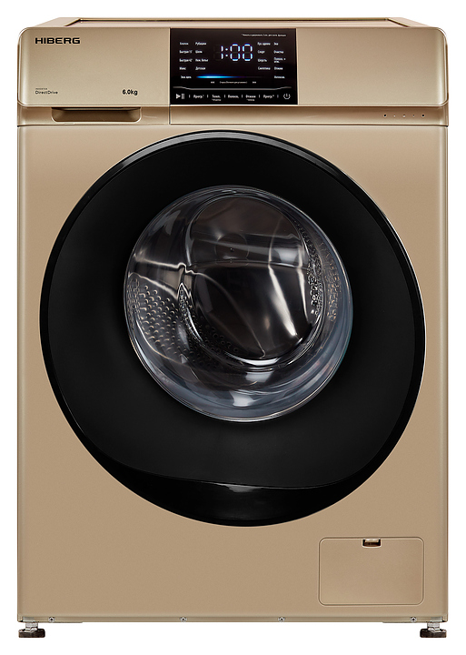 Стиральная машина Hiberg i-DDQ6 - 612 G используется в домашних условиях, а также небольших прачечных для стирки, полоскания и отжима белья, одежды и тканей. Модель оснащена фронтальным загрузочным люком, левосторонней дверью люка со смотровым окном, кабелем питания с вилкой, съемным лотком с 3 отсеками для моющих средств, сенсорной панелью управления с функциональными клавишами, светодиодными цифровым дисплеем и сигнальными индикаторами с символьными и текстовыми сегментами с белой подсветкой. Корпус выполнен из металла с антикоррозийным покрытием золотистого оттенка, крышка двери люка – из прозрачного стекла с черной широкой окантовкой, внешняя крышка двери люка – из прозрачного стекла с декоративной окантовкой черного цвета, барабан – из высококачественной нержавеющей стали, панель управления с черной глянцевой поверхностью.