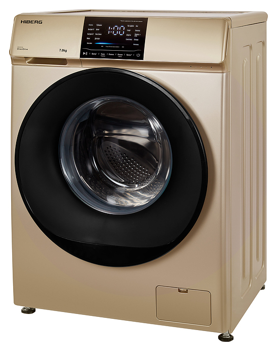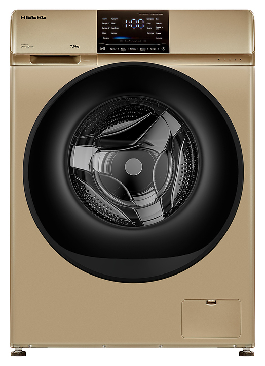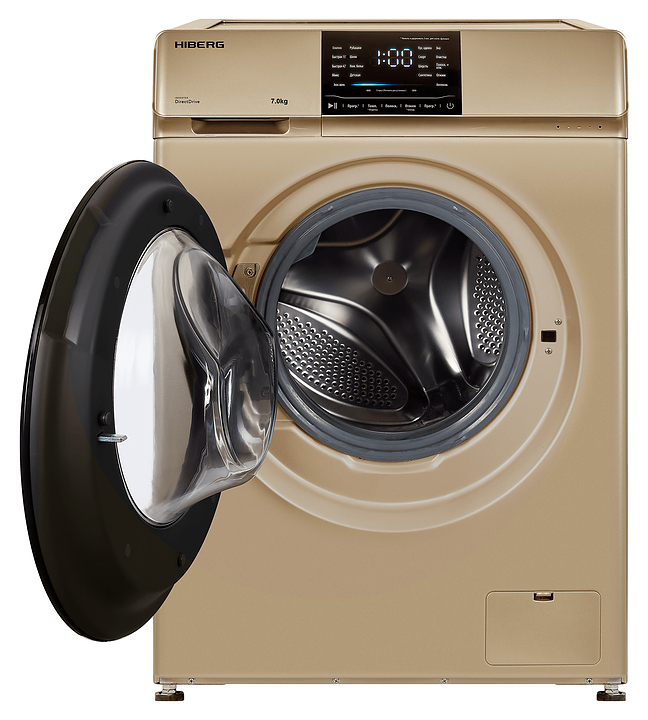 Стиральная машина Hiberg i-DDQ6 - 712 G используется в домашних условиях, а также небольших прачечных для стирки, полоскания и отжима белья, одежды и тканей. Модель оснащена фронтальным загрузочным люком, левосторонней дверью люка со смотровым окном, кабелем питания с вилкой, съемным лотком с 3 отсеками для моющих средств, сенсорной панелью управления с функциональными клавишами, светодиодными цифровым дисплеем и сигнальными индикаторами с символьными и текстовыми сегментами с белой подсветкой. Корпус выполнен из металла с антикоррозийным покрытием золотистого оттенка, крышка двери люка – из прозрачного стекла с черной широкой окантовкой, внешняя крышка двери люка – из прозрачного стекла с декоративной окантовкой черного цвета, барабан – из высококачественной нержавеющей стали, панель управления с черной глянцевой поверхностью.