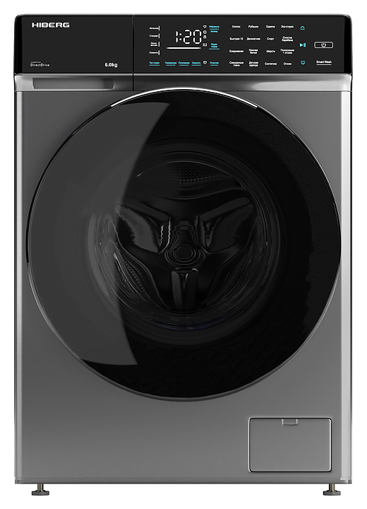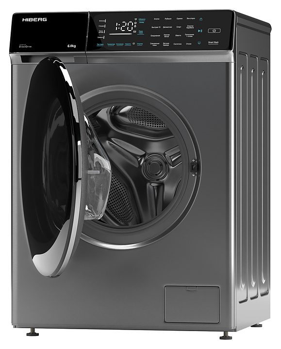 Стиральная машина Hiberg i-DDQ9 - 612 Sd используется в домашних условиях, а также небольших прачечных для стирки, полоскания и отжима белья, одежды и тканей. Модель оснащена фронтальным загрузочным люком, левосторонней дверью люка со смотровым окном, кабелем питания с вилкой, съемным лотком с 3 отсеками для моющих средств, сенсорной панелью управления с функциональными клавишами, светодиодными цифровым дисплеем и сигнальными индикаторами с символьными и текстовыми сегментами с белой подсветкой. Корпус выполнен из металла с антикоррозийным покрытием темно-серого цвета, крышка двери люка – из прозрачного стекла с черной широкой окантовкой, внешняя крышка двери люка – из стекла с полупрозрачной черной тонировкой и глянцевой окантовкой черного цвета, барабан – из высококачественной нержавеющей стали, верхние фронтальные панели с черной глянцевой поверхностью.