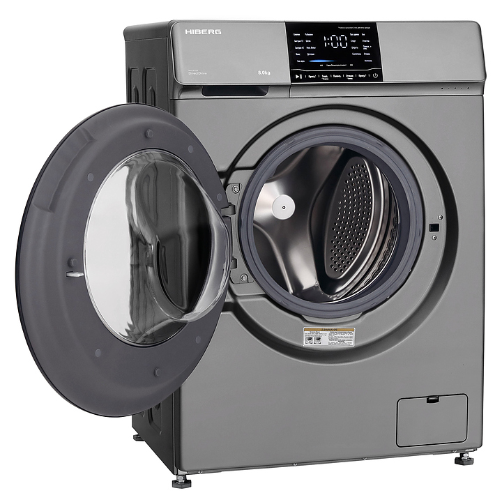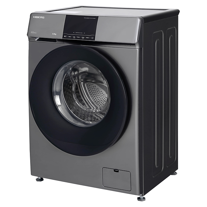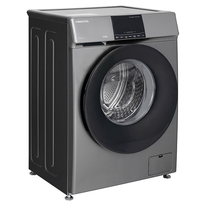 Стиральная машина Hiberg i-DDQ6 - 814 Sd используется в домашних условиях, а также небольших прачечных для стирки, полоскания и отжима белья, одежды и тканей. Модель оснащена фронтальным загрузочным люком, левосторонней дверью люка со смотровым окном, кабелем питания с вилкой, съемным лотком с 3 отсеками для моющих средств, сенсорной панелью управления с функциональными клавишами, светодиодными цифровым дисплеем и сигнальными индикаторами с символьными и текстовыми сегментами с белой подсветкой. Корпус выполнен из металла с антикоррозийным покрытием темно-серого цвета, крышка двери люка – из прозрачного стекла с черной широкой окантовкой, внешняя крышка двери люка – из прозрачного стекла с декоративной окантовкой черного цвета, барабан – из высококачественной нержавеющей стали, панель управления с черной глянцевой поверхностью.