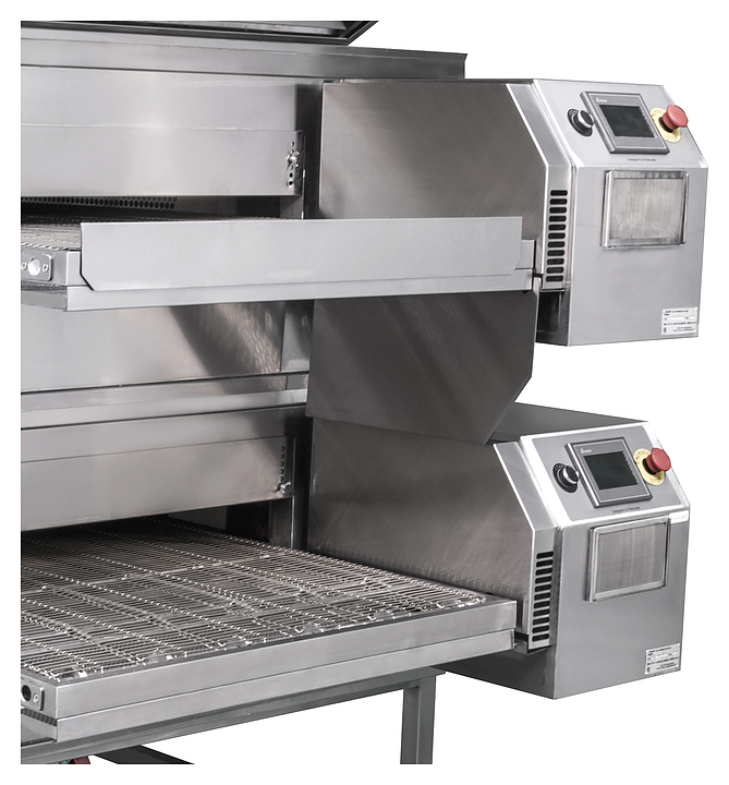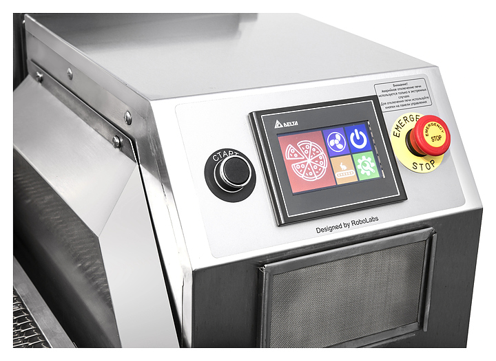 Конвейерная печь RoboLabs RoboChef RC800M Deluxe предназначена для выпечки пиццы на предприятиях общественного питания и торговли. Модель оснащена электронным управлением и цветным сенсорным экраном 4,3”. Корпус выполнен из нержавеющей стали AISI 430. Высокая производительность печи достигается благодаря применению импинджментной системы подвода тепла к продукту (jet impingement flow). Импинджментный подвод тепла к продукту осуществляется направлением нагретого ТЭНами потока горячего воздуха через 445 небольших сопел, расположенных над и под конвейерной сеткой. Благодаря эффекту удара горячего воздуха о продукт обеспечивается очень быстрый теплообмен между горячим воздухом и продуктом, в разы быстрее, чем при традиционном инфракрасном или конвекционном способе подвода тепла, а за счет движения продукта конвейером обеспечивается идеальная равномерность нагрева. В комплект поставки входят 2 скрина для пиццы 30 см и 2 скрина для пиццы 35 см. Особенности: