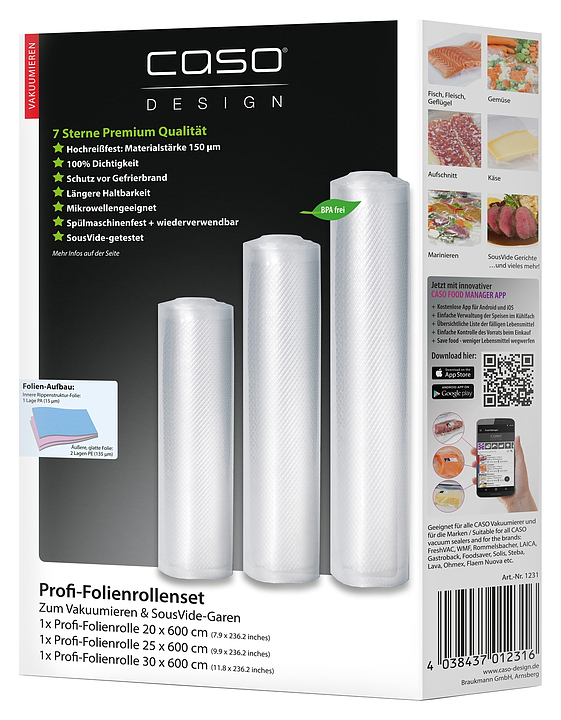 Набор вакуумных рулонов CASO 7 Sterne 20/25/30*600 используется совместно с бескамерными вакууматорами для упаковки продуктов в частных домах и квартирах, а также на предприятиях общественного питания и торговли для последующего их хранения или приготовления по технологии Sous Vide. Изделия выполнены из качественных пищевых полимеров, не содержащих бисфенол А. Особенности: