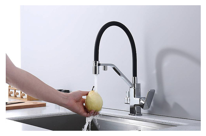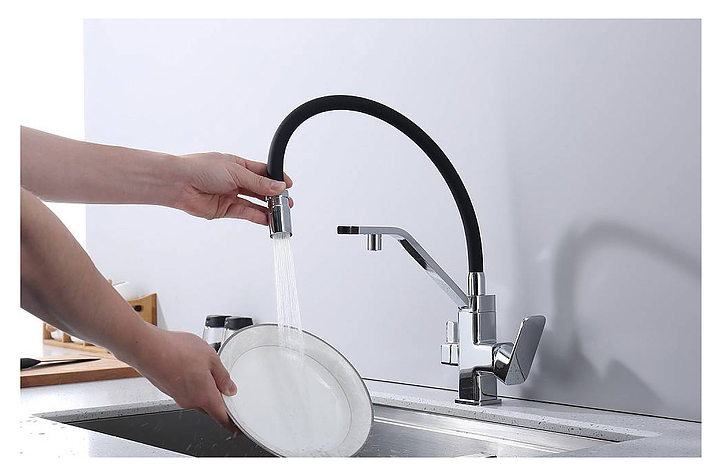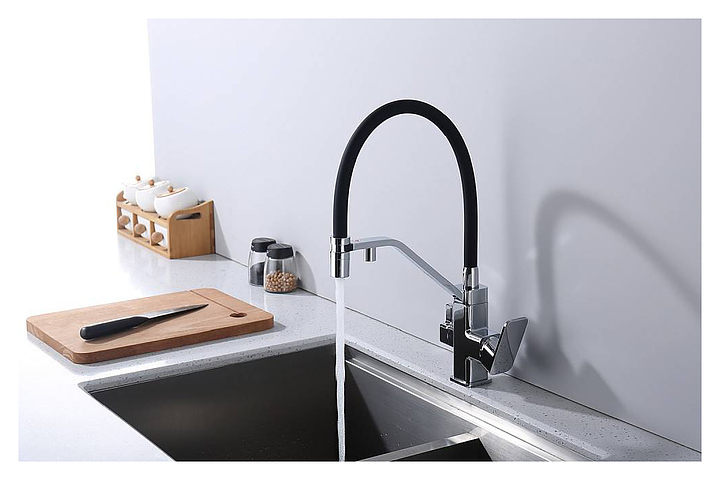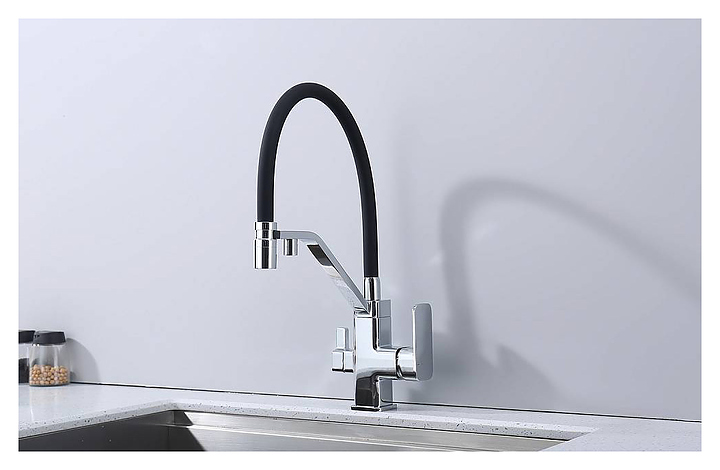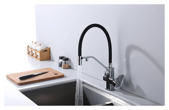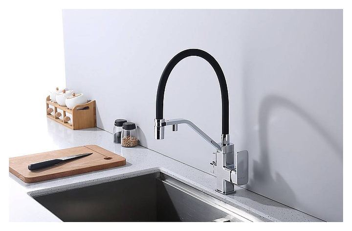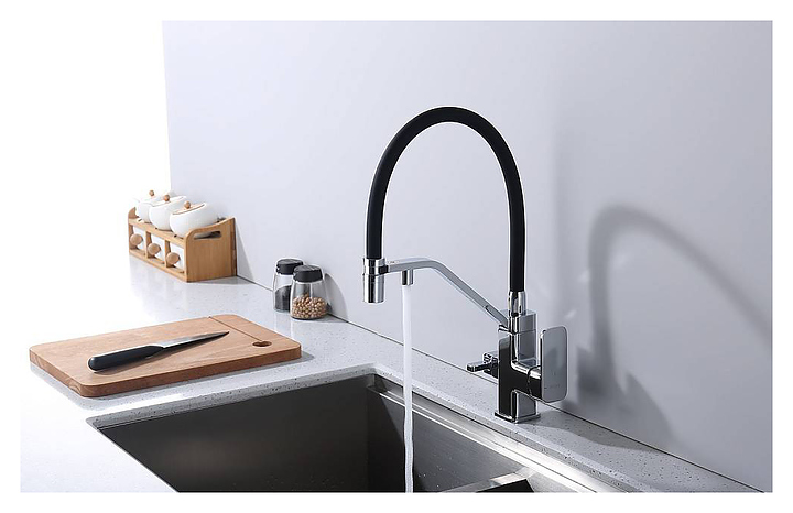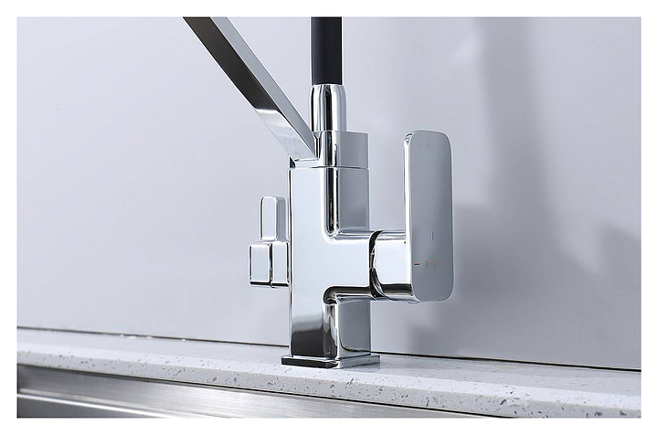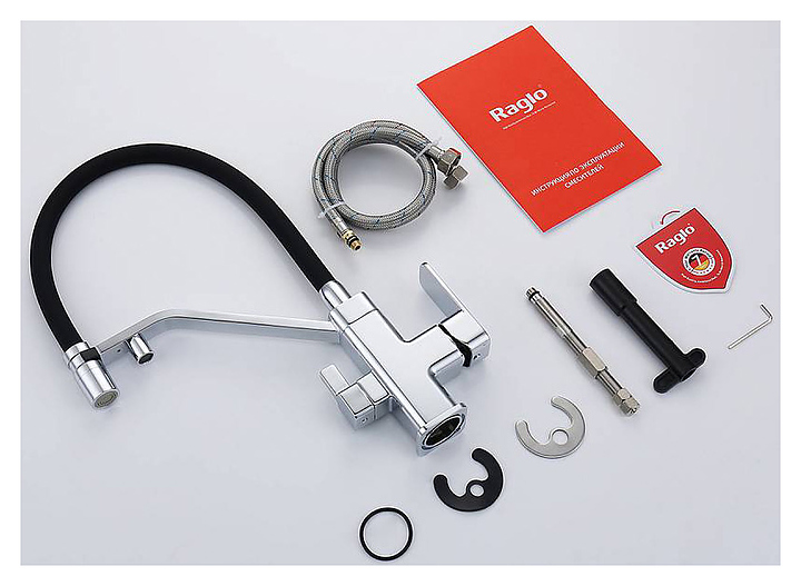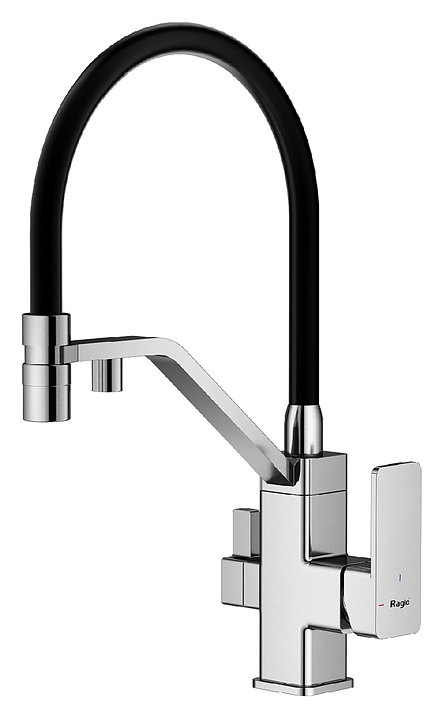 Смеситель Raglo R85.62 предназначен для подачи горячей и холодной воды в кухонных помещениях. Модель оснащена гибким изливом, подключением к фильтру с питьевой водой и керамическим картриджем, который обеспечивает плавный ход рычага смесителя, контроль и точность при выборе напора и температуры воды. Аэратор создает мягкую струю без брызг. Изделие выполнено из высококачественной латуни, отличающейся прочностью, долговечностью и устойчивостью к перепадам температур. В комплект поставки входят смеситель, гибкая подводка и крепления. Дополнительные характеристики: