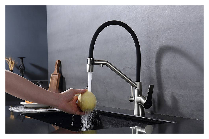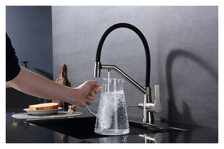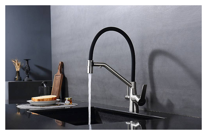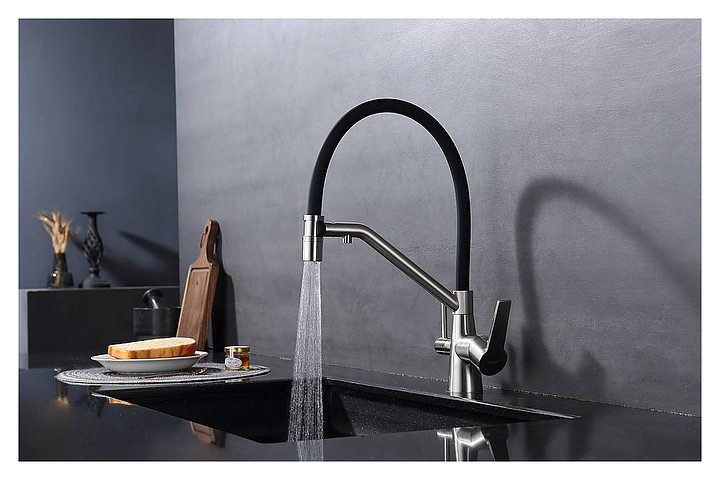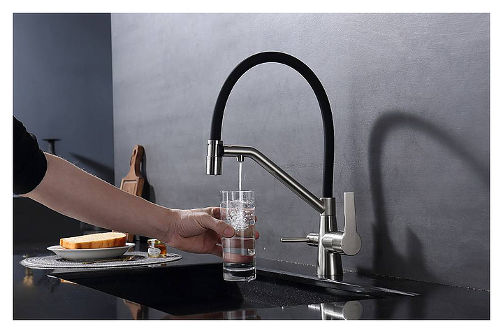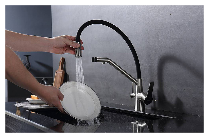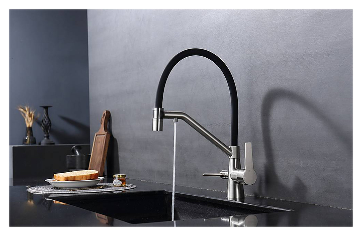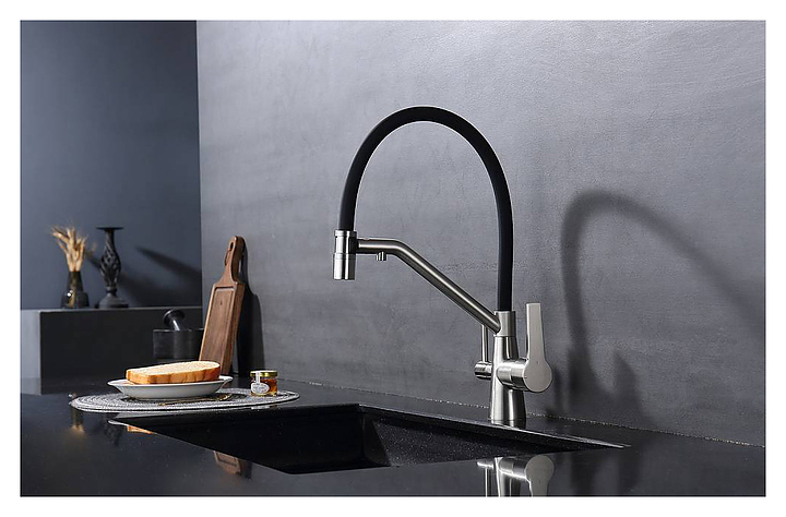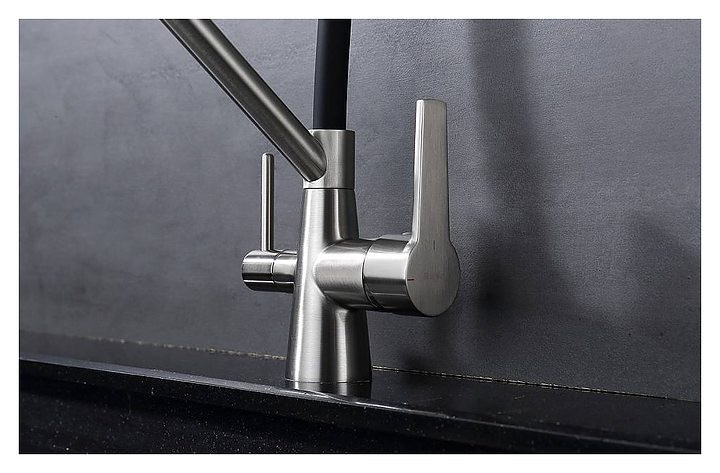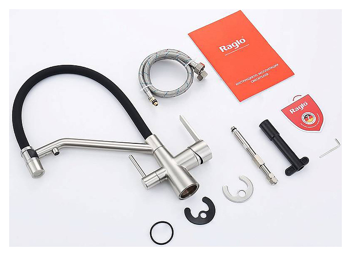 Смеситель Raglo R80.62.05 предназначен для подачи горячей и холодной воды в кухонных помещениях. Модель оснащена съемным гибким изливом на магните, подключением к фильтру с питьевой водой и керамическим картриджем, который обеспечивает плавный ход рычага смесителя, контроль и точность при выборе напора и температуры воды. Аэратор создает мягкую струю без брызг. Изделие выполнено из высококачественной латуни, отличающейся прочностью, долговечностью и устойчивостью к перепадам температур. В комплект поставки входят смеситель, гибкая подводка и крепления. Дополнительные характеристики: