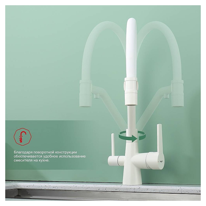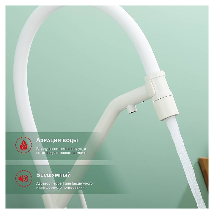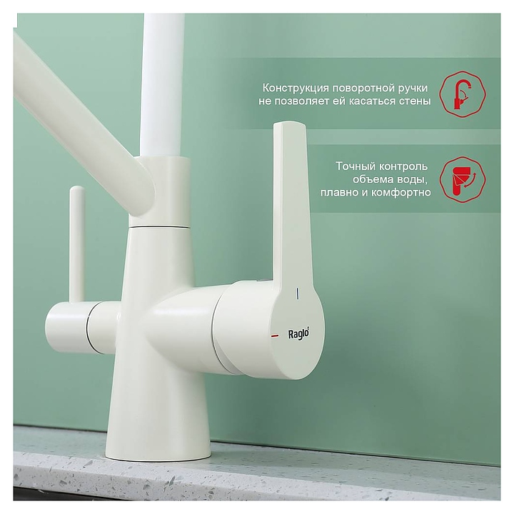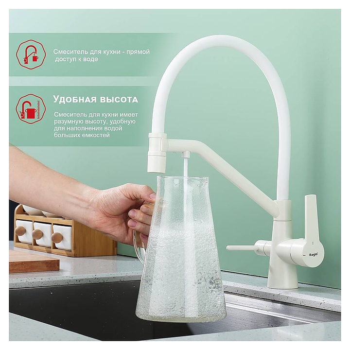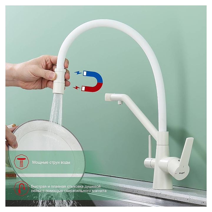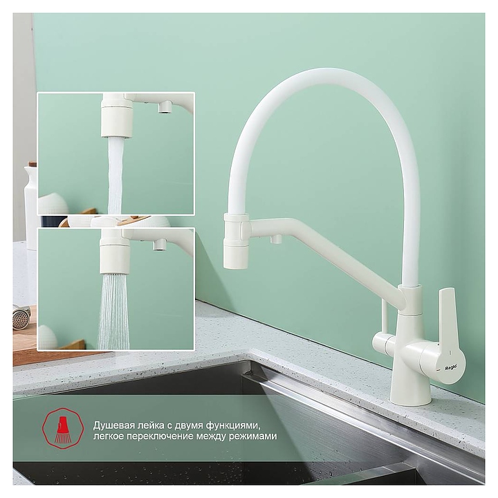 Смеситель Raglo R80.62.08 предназначен для подачи горячей и холодной воды в кухонных помещениях. Модель оснащена съемным гибким изливом на магните, подключением к фильтру с питьевой водой и керамическим картриджем, который обеспечивает плавный ход рычага смесителя, контроль и точность при выборе напора и температуры воды. Аэратор создает мягкую струю без брызг. Изделие выполнено из высококачественной латуни, отличающейся прочностью, долговечностью и устойчивостью к перепадам температур. В комплект поставки входят смеситель, гибкая подводка и крепления. Дополнительные характеристики: