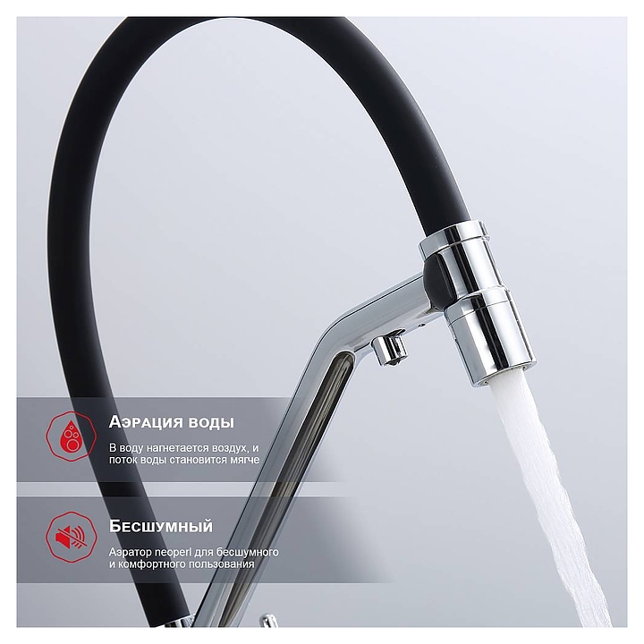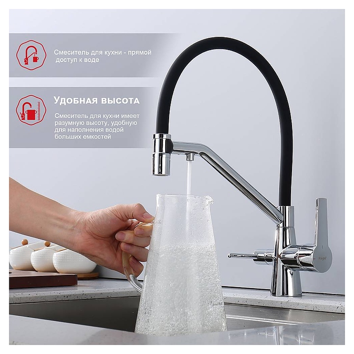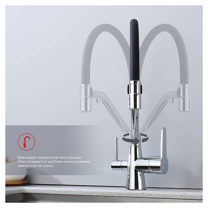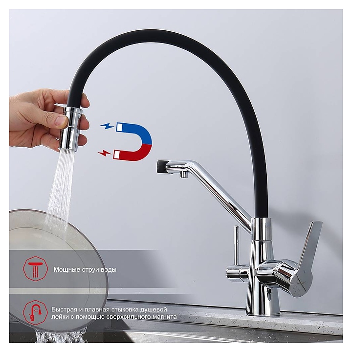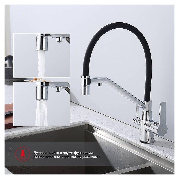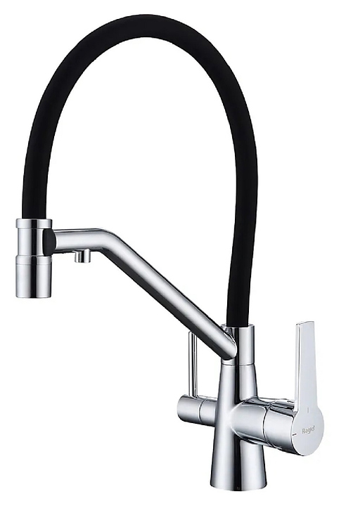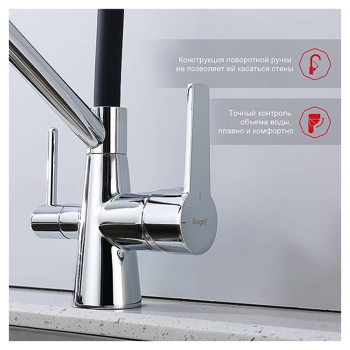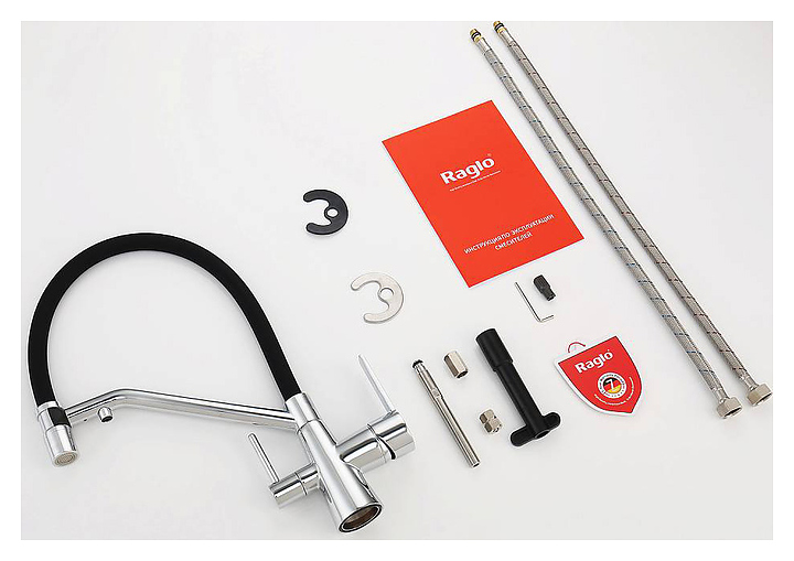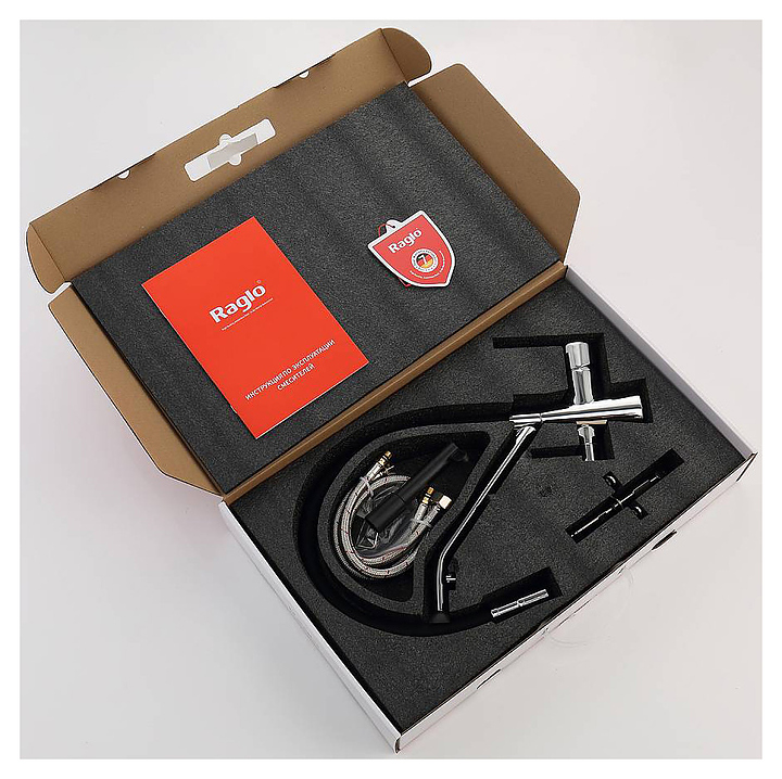 Смеситель Raglo R80.62 предназначен для подачи горячей и холодной воды в кухонных помещениях. Модель оснащена съемным гибким изливом на магните, подключением к фильтру с питьевой водой и керамическим картриджем, который обеспечивает плавный ход рычага смесителя, контроль и точность при выборе напора и температуры воды. Аэратор создает мягкую струю без брызг. Изделие выполнено из высококачественной латуни, отличающейся прочностью, долговечностью и устойчивостью к перепадам температур. В комплект поставки входят смеситель, гибкая подводка и крепления. Дополнительные характеристики: