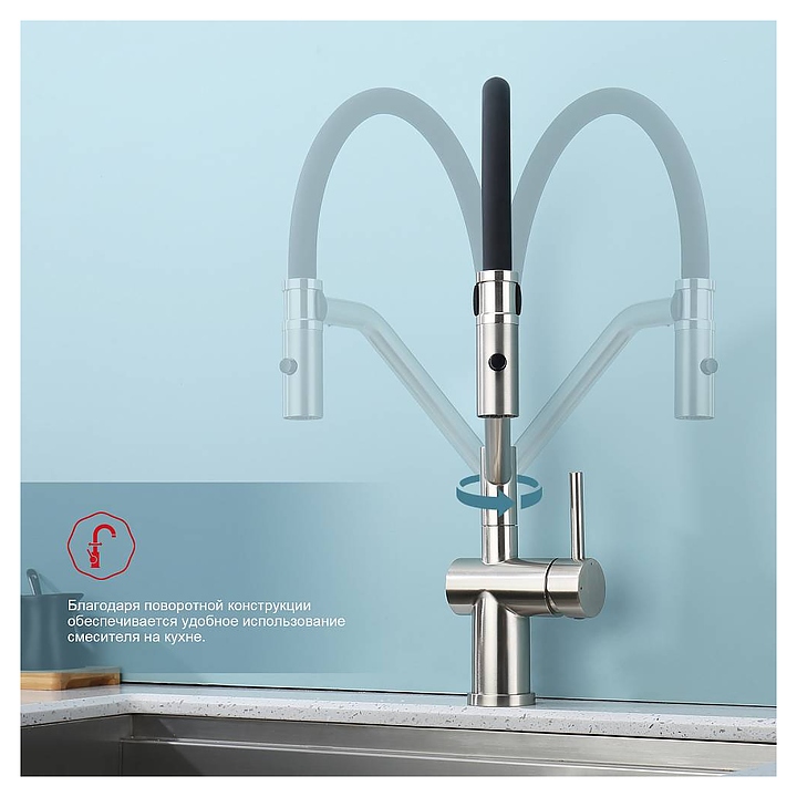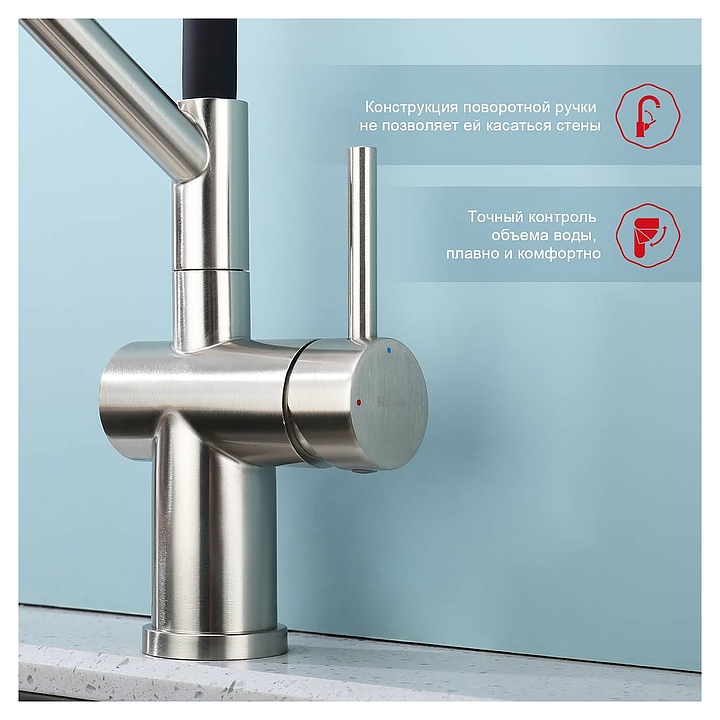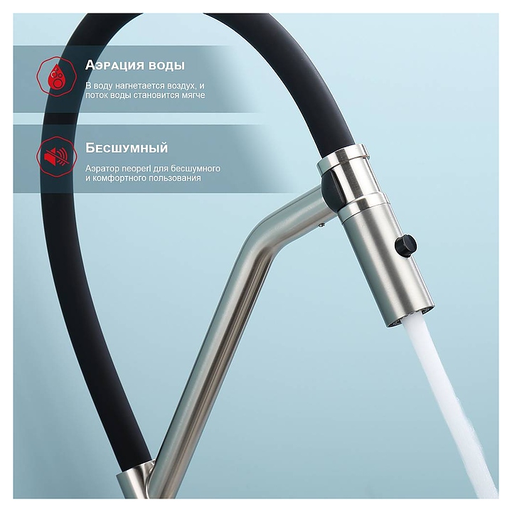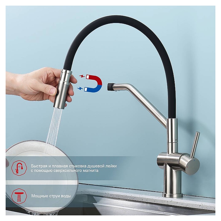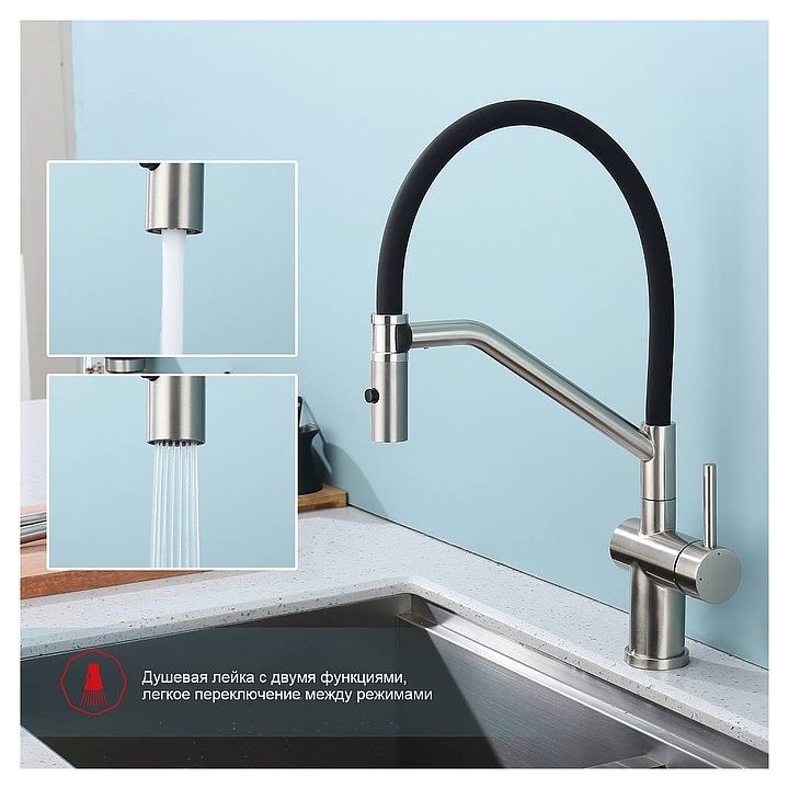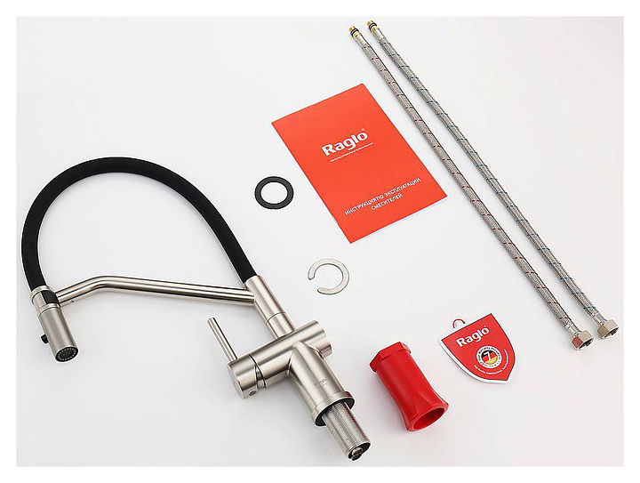Смеситель Raglo R86.41.05 предназначен для подачи горячей и холодной воды в кухонных помещениях. Модель оснащена съемным гибким изливом на магните, 2-режимной лейкой и керамическим картриджем, который обеспечивает плавный ход рычага смесителя, контроль и точность при выборе напора и температуры воды. Встроенный аэратор эффективно фильтрует примеси и уменьшает шум от импульсов воды. Корпус выполнен из высококачественной нержавеющей стали, отличающейся прочностью, долговечностью и устойчивостью к коррозии. В комплект поставки входят смеситель, гибкая подводка и крепления. Дополнительные характеристики: