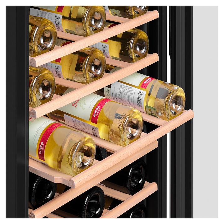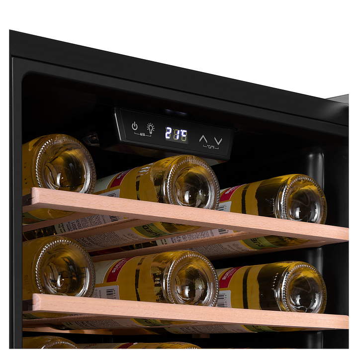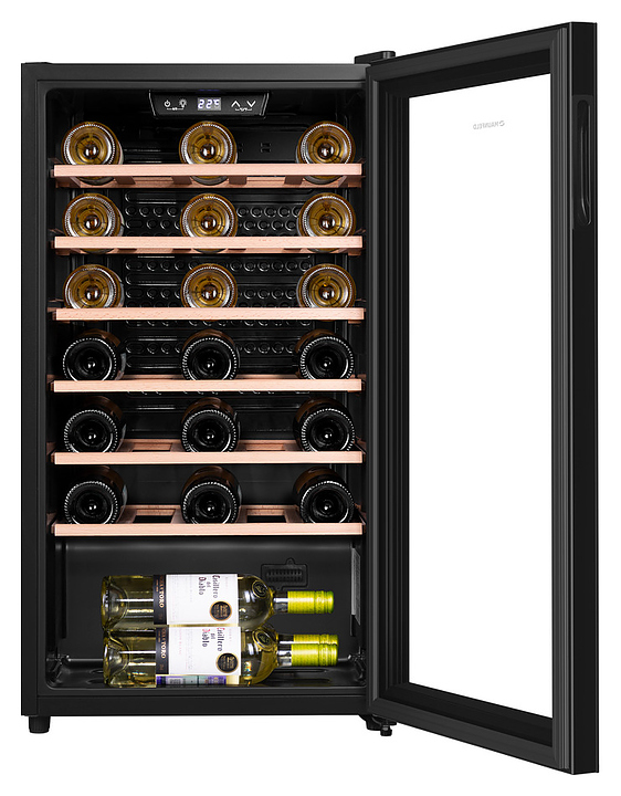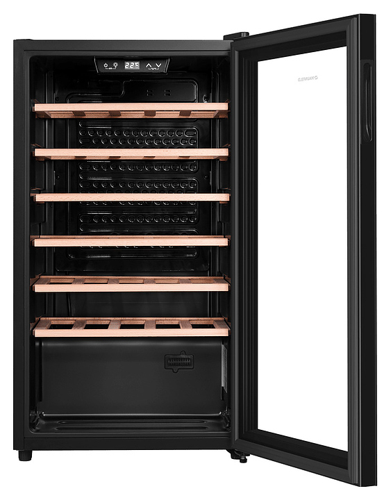 Винный шкаф Maunfeld MFWC-85S34 предназначен для хранения при оптимальных условиях и предпродажной демонстрации бутилированного вина различных сортов в барах, ресторанах, специализированных магазинах, подсобных складских помещениях, а также домашних условиях. Модель оснащена холодильной камерой с правосторонней распашной дверью, расположенной внутри камеры панелью управления с функциональными сенсорными клавишами и светодиодным дисплеем с белой подсветкой индикации. Корпус выполнен из стали с антикоррозийным покрытием черного цвета, дверь с полным фронтальным остеклением без винтового крепежа из прозрачного стекла с дымчатой тонировкой, внутренняя облицовка камеры черного цвета, полки – из массива буковой древесины. В комплект поставки входят 6 съемных полок с направляющими для размещения бутылок, инструкция по эксплуатации, гарантийный талон и заводская упаковка. Особенности: