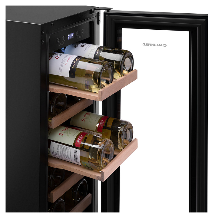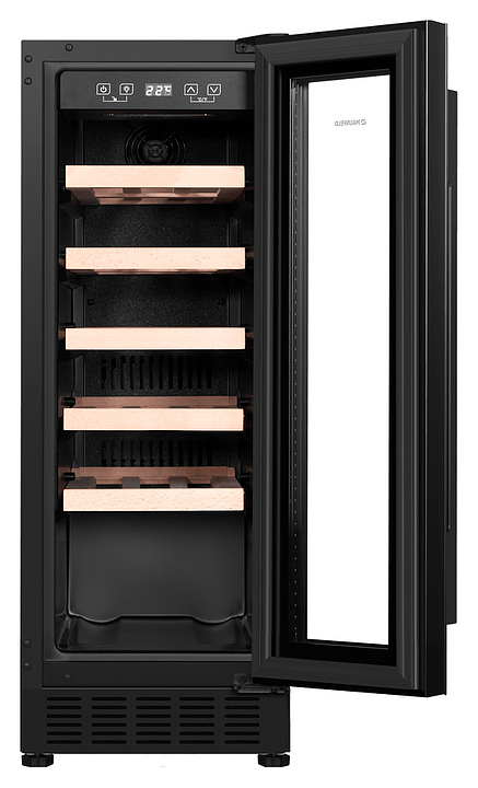 Винный шкаф Maunfeld MBWC-56S20 предназначен для хранения при оптимальных условиях и предпродажной демонстрации бутилированного вина различных сортов в барах, ресторанах, специализированных магазинах, подсобных складских помещениях, а также домашних условиях. Модель оснащена холодильной камерой с правосторонней распашной дверью, длинной уплощенной вертикальной рукояткой, расположенной внутри камеры панелью управления с функциональными сенсорными клавишами и светодиодным дисплеем с белой подсветкой индикации. Корпус выполнен из стали с антикоррозийным покрытием черного цвета, дверь с полным фронтальным остеклением без винтового крепежа из прозрачного стекла с дымчатой тонировкой, внутренняя облицовка камеры черного цвета, полки – из массива буковой древесины. В комплект поставки входят 5 съемных полок с направляющими для размещения бутылок, крепеж для рукоятки, инструкция по эксплуатации, гарантийный талон и заводская упаковка. Особенности:
