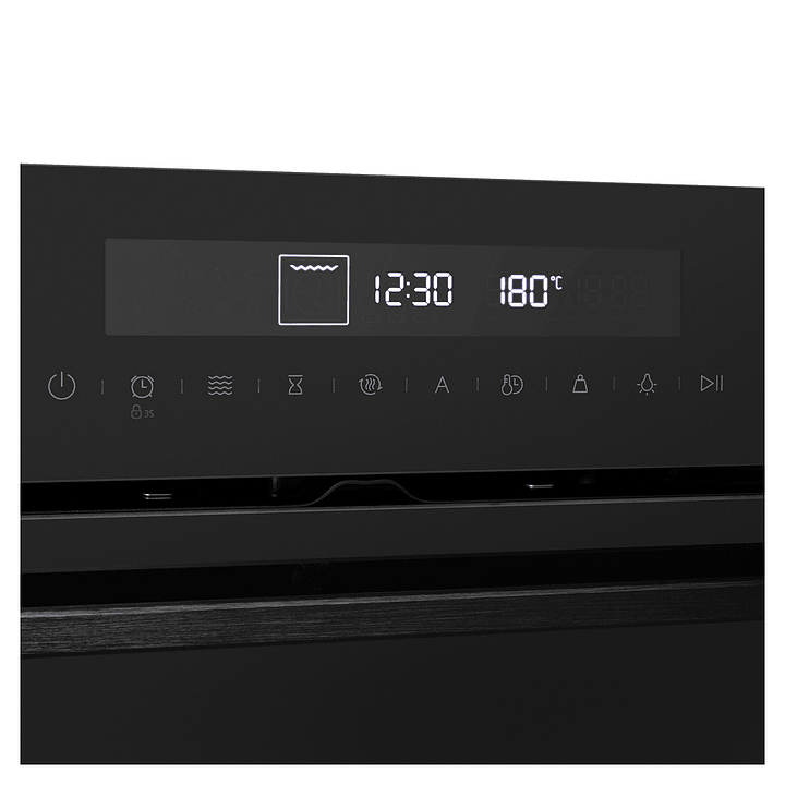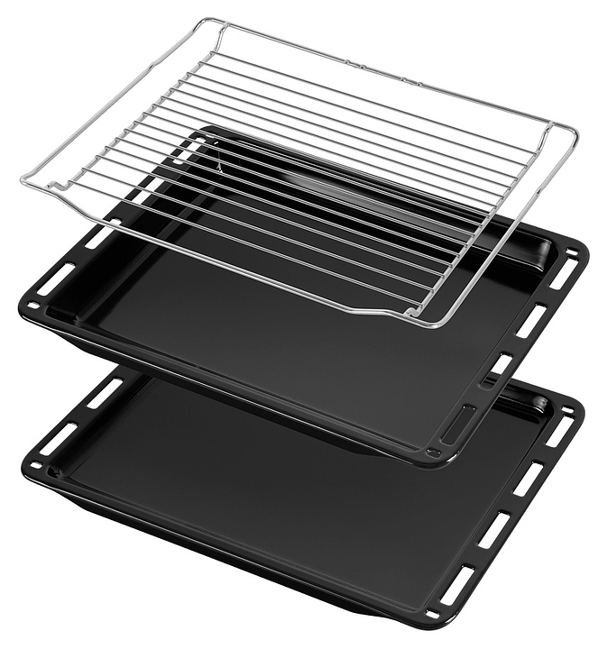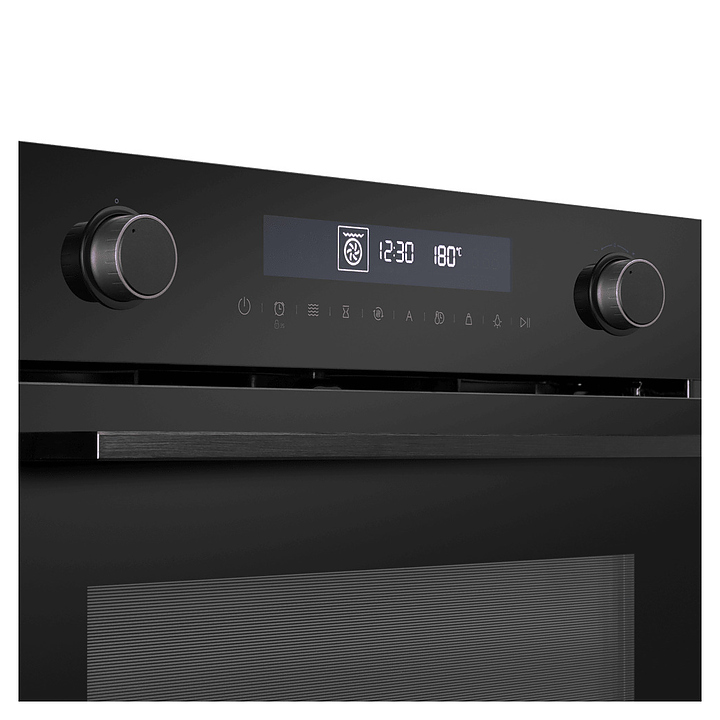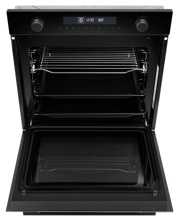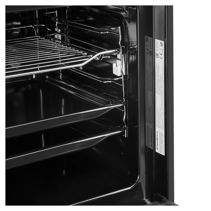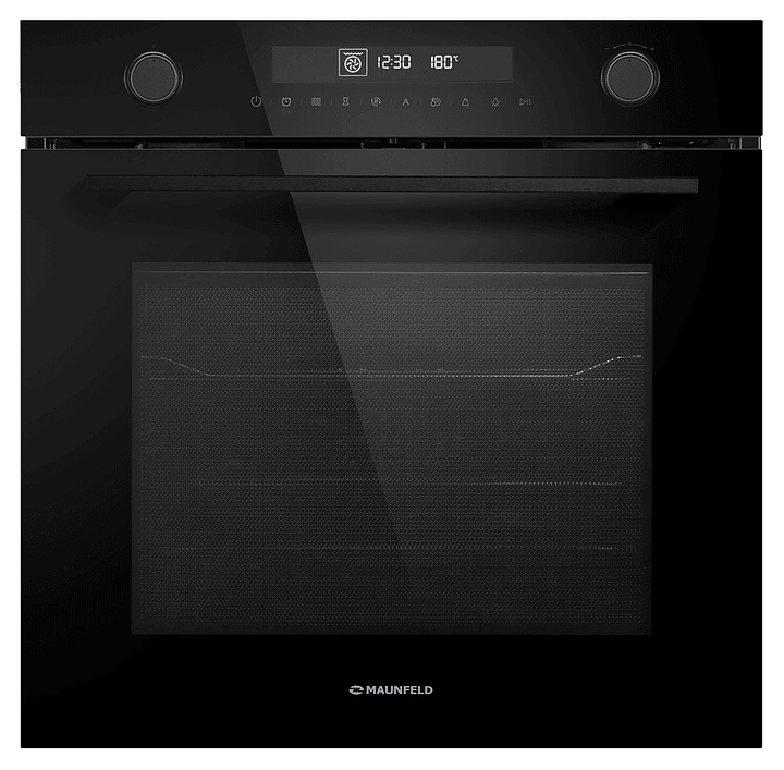 Встраивамый электрический духовой шкаф Maunfeld MEOR7217DMB2 предназначен для приготовления большого ассортимента блюд в домашних условиях. Модель оснащена камерой с расположенными в задней стенке кольцевым нагревательным элементом и вентилятором, магнетроном, верхним и нижним нагревательными элементами, верхним грилем, 2 боковыми стойками с 5 уровнями направляющих для противней, откидной дверью со смотровым окном, горизонтальной рукояткой, кабелем питания с вилкой, расположенной в верхней части фронта панелью управления с 2 поворотными цилиндрическими переключателями, сенсорными функциональными клавишами и информативным светодиодным дисплеем с белой подсветкой индикации. Корпус выполнен из высококачественной стали, фронтс покрытием черного цвета и полным остеклением без винтового крепежа прозрачным стеклом, боковые стойки и решетка для гриля – из стали с хромированной поверхностью, противни – из стали с эмалированным покрытием, рукоятка и переключатели – из металла с черной матовой поверхностью.