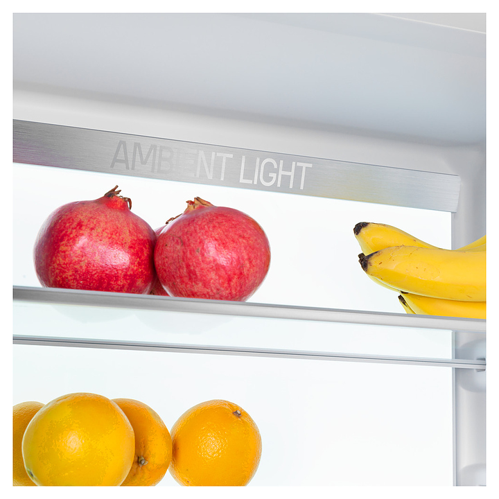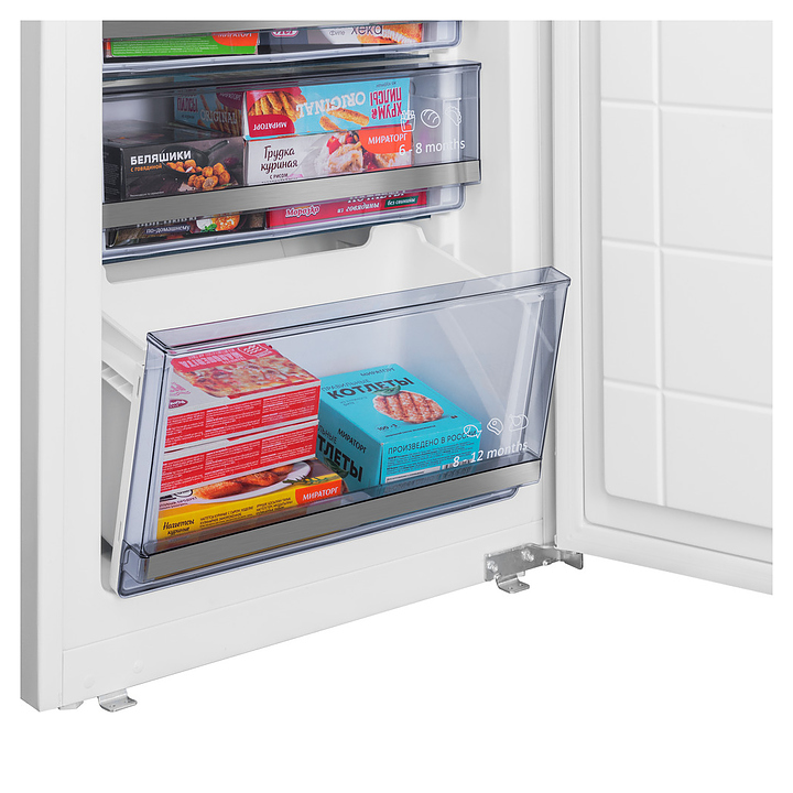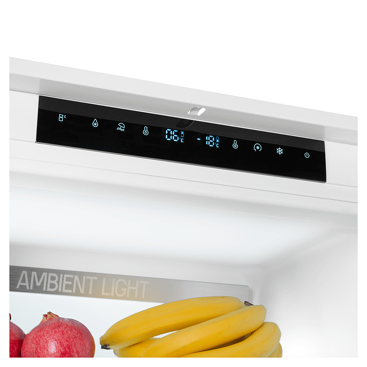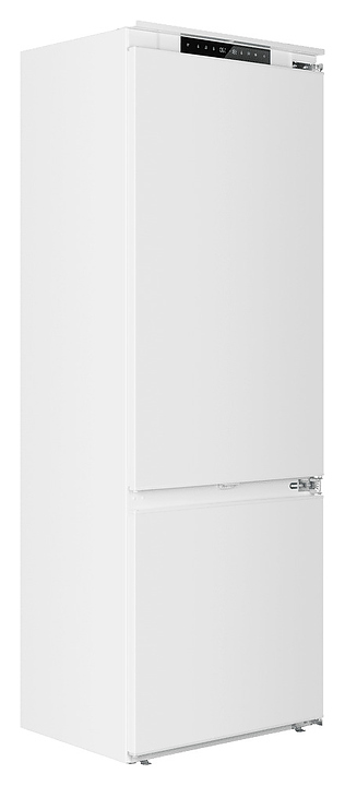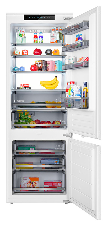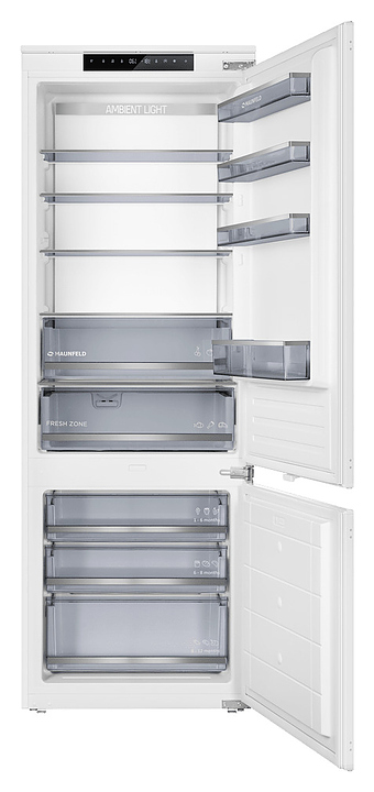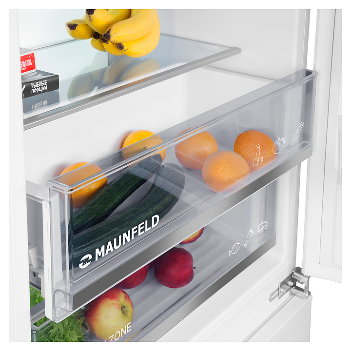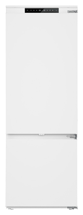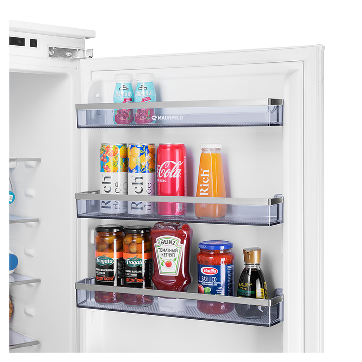 Встраиваемый холодильник Maunfeld MBF19369NFWGR LUXпредназначен для охлаждения, замораживания, кратковременного и длительного хранения пищевых продуктов и напитков в гостиничных комплексах, офисах, а также домашних условиях. Модель оснащена холодильной камерой сверху и морозильной камерой снизу, правосторонними перенавешиваемыми распашными дверьми, кабелем питания с евровилкой, расположенными за дверью холодильной камеры в верхней части фронта панелью управления с сенсорными функциональными клавишами, светодиодными сигнальными лампами и 2 цифровыми дисплеями с белой подсветкой индикации. Боковины и двери выполнены из стали с антикоррозийным покрытием белого цвета, внутренняя облицовка камер – из белого пластика, плоские полки – из прозрачного закаленного стекла, ящики – из белого пластика с прозрачным фронтом, навесные полки – из прозрачного пластика, ящики и полки декорированы окантовками серебристого оттенка, упаковка – из гофрокартона и полимерной пленки.