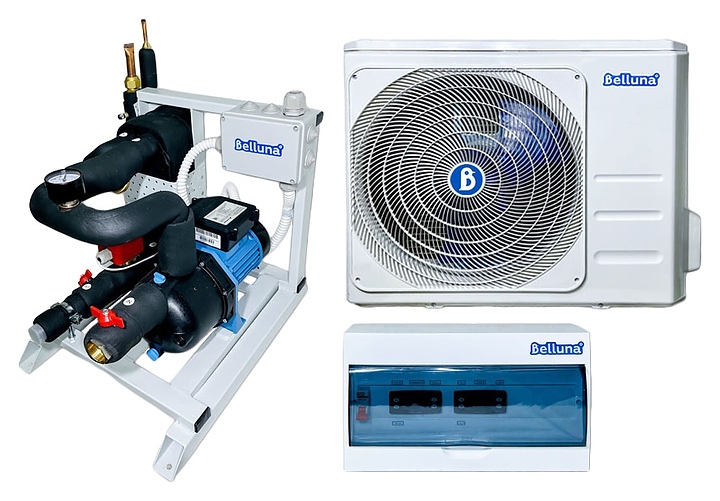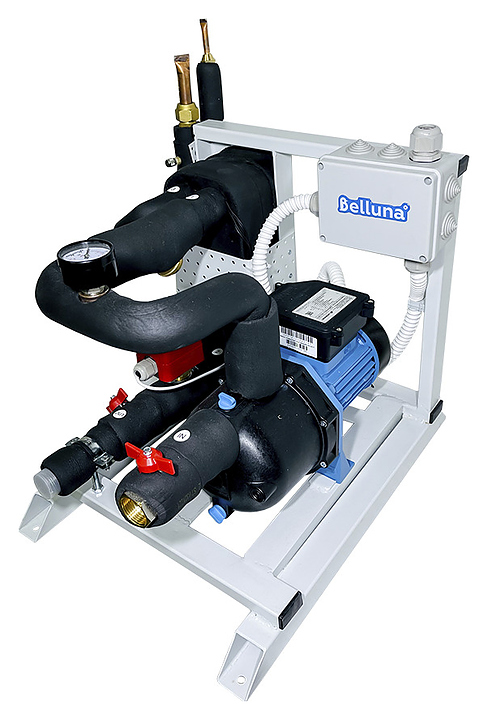Чиллер водяного охлаждения Belluna X35 предназначен для охлаждения различного оборудования на предприятиях пищевой, фармацевтической, машиностроительной и других направлений промышленности, а также хозяйственно-бытовых объектах для охлаждения большого количества воды, например, купели в загородном доме, где нет скважины. В качестве теплоносителя используется вода или этилен(пропилен)гликолиевая смесь. Наружный блок имеет корпус, теплообменник, двигатель с крыльчаткой, запорные вентили, защитные решетку и крышку для вентилей, щит оснащен прозрачной защитной крышкой. Комплектация: