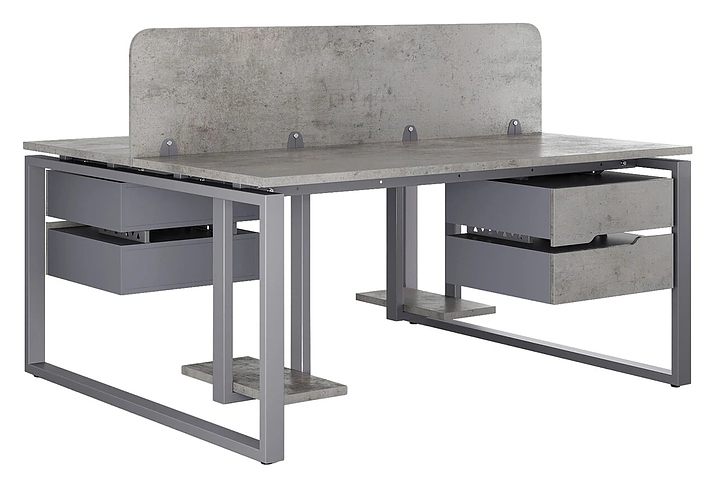 Офисный стол Кобор O1/2-140/160 graphite/chicago на 2 рабочих места используется в офисных помещениях и кабинетах руководителей. Модель оснащена O-образными опорами. Каркас и опоры выполнены из металла, выкрашенного в цвет графит муар (RAL7024), столешница – из ламинированной древесно-стружечной плиты (ЛДСП) цвета бетон чикаго (F186 ST9). Дополнительные характеристики: