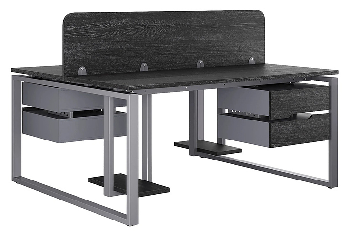 Офисный стол Кобор O1/2-100/120 graphite/glazed на 2 рабочих места используется в офисных помещениях и кабинетах руководителей. Модель оснащена O-образными опорами. Каркас и опоры выполнены из металла, выкрашенного в цвет графит муар (RAL7024), столешница – из ламинированной древесно-стружечной плиты (ЛДСП) цвета черный дуб (H3178 ST37). Дополнительные характеристики: