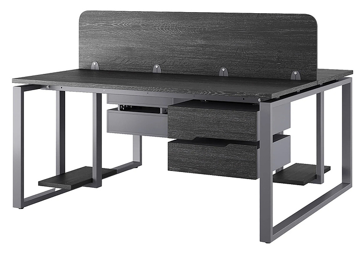 Офисный стол Кобор O1/2-80/160 graphite/glazed на 2 рабочих места используется в офисных помещениях и кабинетах руководителей. Модель оснащена O-образными опорами. Каркас и опоры выполнены из металла, выкрашенного в цвет графит муар (RAL7024), столешница – из ламинированной древесно-стружечной плиты (ЛДСП) цвета черный дуб (H3178 ST37). Дополнительные характеристики: