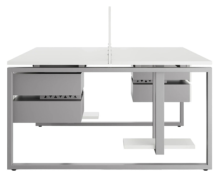 Офисный стол Кобор O1/2-160/140 aluminum/premium на 2 рабочих места используется в офисных помещениях и кабинетах руководителей. Модель оснащена O-образными опорами. Каркас и опоры выполнены из металла, выкрашенного в цвет алюминиевый металлик (RAL9006), столешница – из ламинированной древесно-стружечной плиты (ЛДСП) цвета белый премиум (W1000 ST9). Дополнительные характеристики: