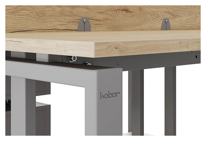 Офисный стол Кобор O1/2-160/160 aluminum/natural на 2 рабочих места используется в офисных помещениях и кабинетах руководителей. Модель оснащена O-образными опорами. Каркас и опоры выполнены из металла, выкрашенного в цвет алюминиевый металлик (RAL9006), столешница – из ламинированной древесно-стружечной плиты (ЛДСП) цвета натуральный дуб (H1180 ST37). Дополнительные характеристики: