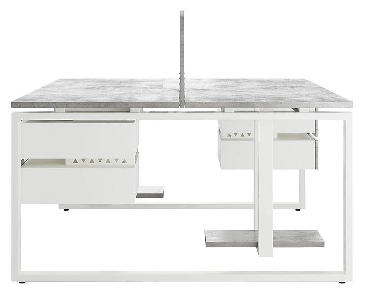 Офисный стол Кобор O1/2-140/120 white/chicago на 2 рабочих места используется в офисных помещениях и кабинетах руководителей. Модель оснащена O-образными опорами. Каркас и опоры выполнены из металла, выкрашенного в цвет белый муар (RAL9016), столешница – из ламинированной древесно-стружечной плиты (ЛДСП) цвета бетон чикаго (F186 ST9). Дополнительные характеристики: