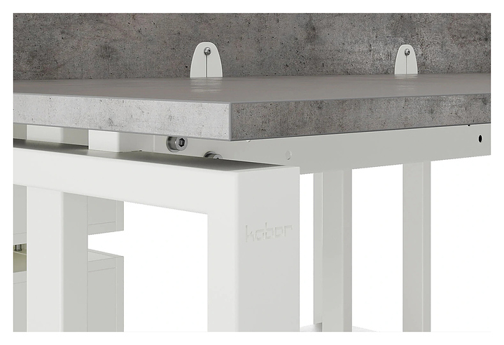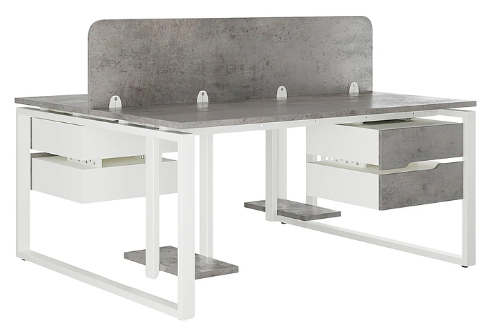 Офисный стол Кобор O1/2-160/140 white/chicago на 2 рабочих места используется в офисных помещениях и кабинетах руководителей. Модель оснащена O-образными опорами. Каркас и опоры выполнены из металла, выкрашенного в цвет белый муар (RAL9016), столешница – из ламинированной древесно-стружечной плиты (ЛДСП) цвета бетон чикаго (F186 ST9). Дополнительные характеристики: