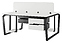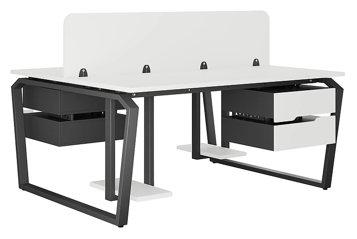 Офисный стол Кобор TB/2-140/120 black/premium на 2 рабочих места используется в офисных помещениях и кабинетах руководителей. Модель оснащена опорами в форме обратной трапеции со скошенными верхними углами. Каркас и опоры выполнены из металла, выкрашенного в цвет черный муар (RAL9005), столешница – из ламинированной древесно-стружечной плиты (ЛДСП) цвета белый премиум (W1000 ST9). Дополнительные характеристики: