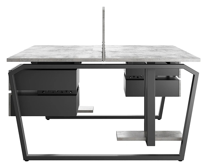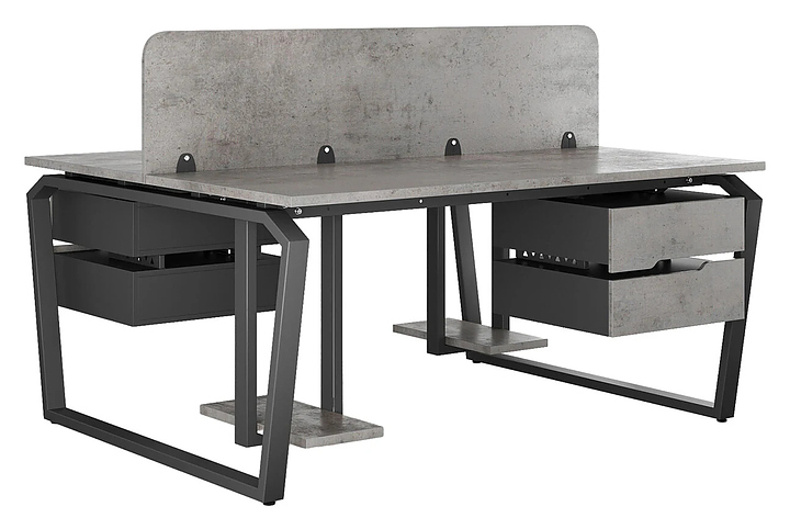 Офисный стол Кобор TB/2-140/120 black/chicago на 2 рабочих места используется в офисных помещениях и кабинетах руководителей. Модель оснащена опорами в форме обратной трапеции со скошенными верхними углами. Каркас и опоры выполнены из металла, выкрашенного в цвет черный муар (RAL9005), столешница – из ламинированной древесно-стружечной плиты (ЛДСП) цвета бетон чикаго (F186 ST9). Дополнительные характеристики: