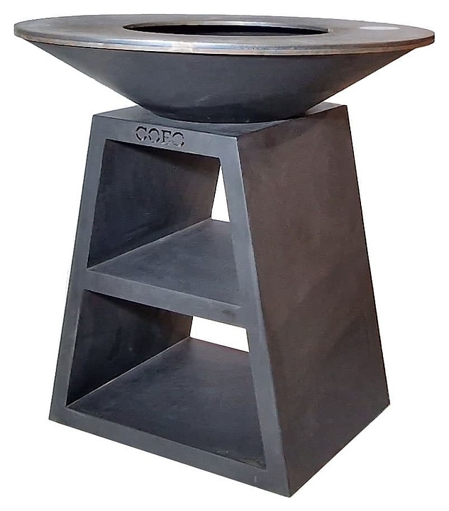 Уличный гриль COEO TRIO 98 серии Brasero используется на уличных площадках баров, кафе, других небольших предприятий общественного питания, кемпингов, частных домов и дач для жарки овощей, рыбы, приготовления шашлыка, а также различных тушеных блюд в чугунной посуде. Модель оснащена трапецевидной подставкой, конически расширенным кверху очагом и съемной круглой планчой с расположенной под небольшим наклоном к широкому отверстию в центре рабочей поверхностью. Подставка и очаг выполнены из высококачественной устойчивой к атмосферным воздействиям горячеоцинкованной стали с матовым покрытием порошковой краской черного цвета, планча – из безопасной для пищевой продукции толстостенной стали с серебристой поверхностью. Комплектация: