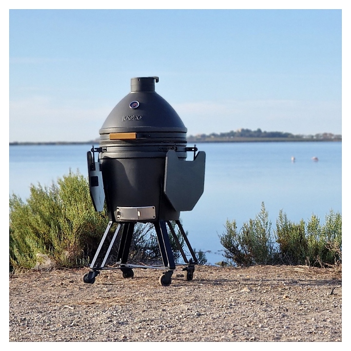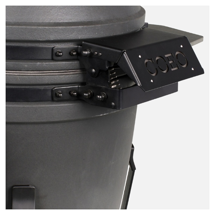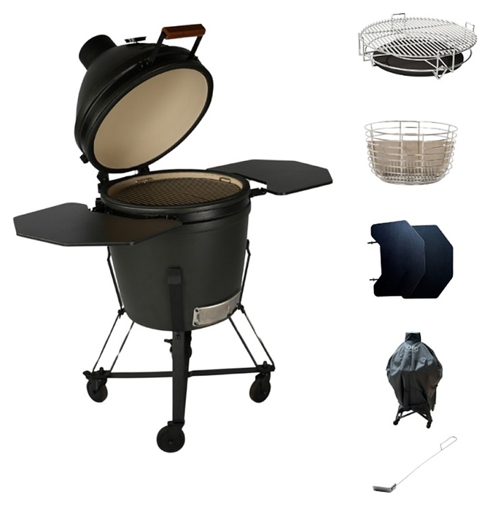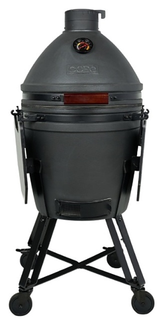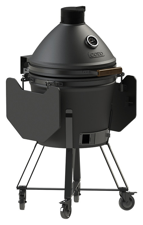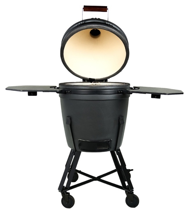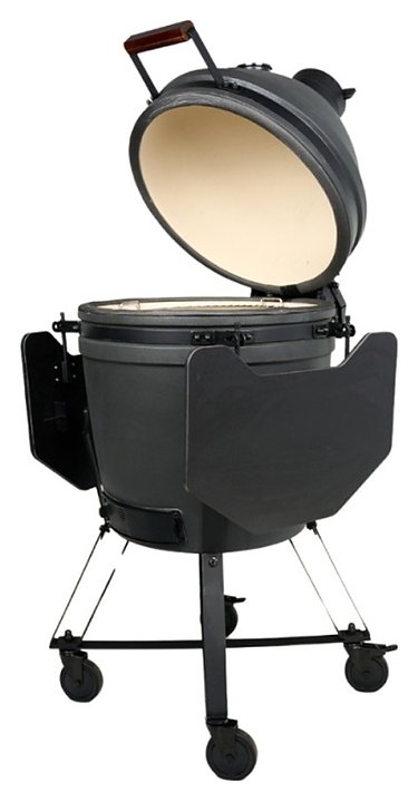 Керамический гриль Quatro L серии Camado используется на уличных площадках баров, кафе, других небольших предприятий общественного питания, кемпингов, частных домов и дач для приготовления широкого ассортимента выпечки, закусок, основных блюд и десертов. Прибор сочетает в себе 4 вида оборудования для высокотемпературного приготовления пищи: коптильня, духовка, барбекю и гриль. Модель оснащена откидной крышкой c термоизолированной рукояткой. Корпус и крышка выполнены из муллитовой керамики с матовой черной поверхностью, заслонка верхнего люка и колосник – из чугуна, заслонка бокового люка – из нержавеющей стали с покрытием черной порошковой краской, рукоятка крышки – из стали с накладкой из тикового дерева, тележка – из стали с антикоррозийным лакокрасочным покрытием черного цвета, боковые полки – из пластика высокого давления (HPL) с черной поверхностью, корзина для угля – из нержавеющей стали, универсальная решетка – из нержавеющей стали марки 304L, чехол – из 100% полиэстера Oxford плотностью 600D с влагонепроницаемым полиуретановым покрытием. Комплектация: