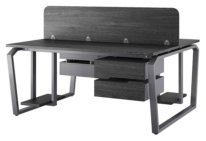 Офисный стол Кобор TB/2-100/160 graphite/glazed на 2 рабочих места используется в офисных помещениях и кабинетах руководителей. Модель оснащена опорами в форме обратной трапеции со скошенными верхними углами. Каркас и опоры выполнены из металла, выкрашенного в цвет графит муар (RAL7024), столешница – из ламинированной древесно-стружечной плиты (ЛДСП) цвета черный дуб (H3178 ST37). Дополнительные характеристики: