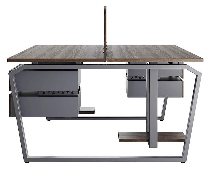Офисный стол Кобор TB/2-100/140 graphite/charlston на 2 рабочих места используется в офисных помещениях и кабинетах руководителей. Модель оснащена опорами в форме обратной трапеции со скошенными верхними углами. Каркас и опоры выполнены из металла, выкрашенного в цвет графит муар (RAL7024), столешница – из ламинированной древесно-стружечной плиты (ЛДСП) цвета дуб чарльстон (H3154 ST36). Дополнительные характеристики: