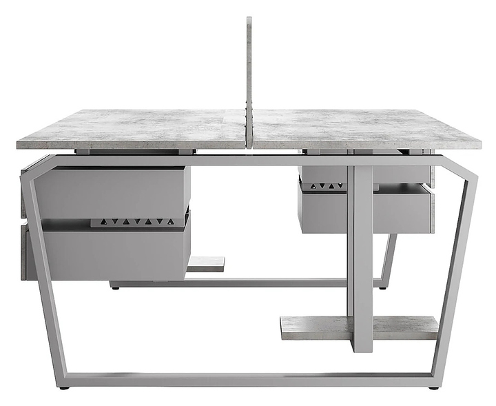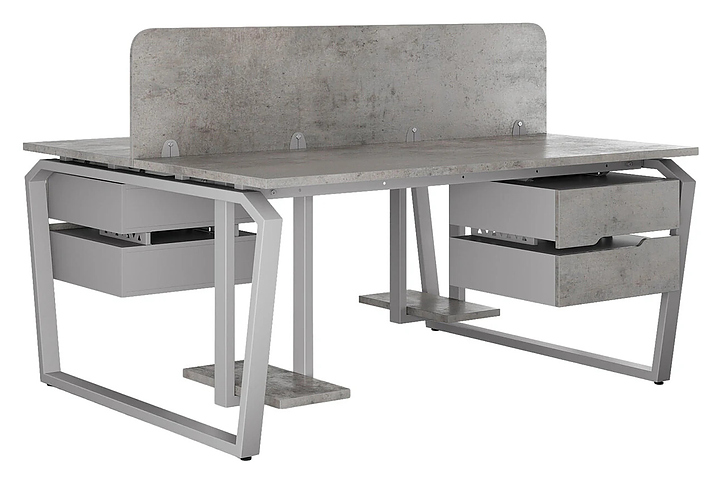 Офисный стол Кобор TB/2-140/160 aluminum/chicago на 2 рабочих места используется в офисных помещениях и кабинетах руководителей. Модель оснащена опорами в форме обратной трапеции со скошенными верхними углами. Каркас и опоры выполнены из металла, выкрашенного в цвет алюминиевый металлик (RAL9006), столешница – из ламинированной древесно-стружечной плиты (ЛДСП) цвета бетон чикаго (F186 ST9). Дополнительные характеристики: