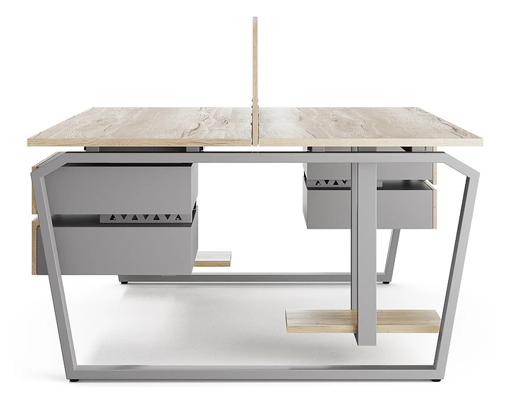Офисный стол Кобор TB/2-120/160 aluminum/natural на 2 рабочих места используется в офисных помещениях и кабинетах руководителей. Модель оснащена опорами в форме обратной трапеции со скошенными верхними углами. Каркас и опоры выполнены из металла, выкрашенного в цвет алюминиевый металлик (RAL9006), столешница – из ламинированной древесно-стружечной плиты (ЛДСП) цвета натуральный дуб (H1180 ST37). Дополнительные характеристики: