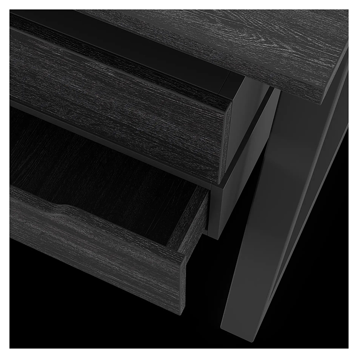 Офисный стол Кобор TR/2-180/120 black/glazed на 2 рабочих места используется в офисных помещениях и кабинетах руководителей. Модель оснащена опорами в форме трапеции. Каркас и опоры выполнены из металла, выкрашенного в цвет черный муар (RAL9005), столешница – из ламинированной древесно-стружечной плиты (ЛДСП) цвета черный дуб (H3178 ST37). Дополнительные характеристики: