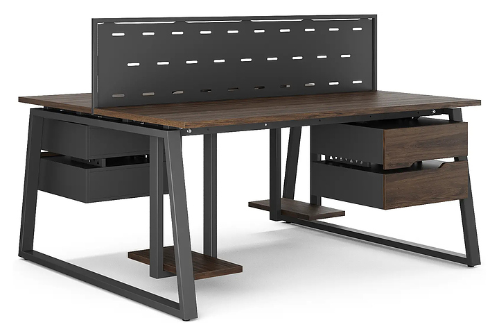 Офисный стол Кобор TR/2-140/120 black/charlston на 2 рабочих места используется в офисных помещениях и кабинетах руководителей. Модель оснащена опорами в форме трапеции. Каркас и опоры выполнены из металла, выкрашенного в цвет черный муар (RAL9005), столешница – из ламинированной древесно-стружечной плиты (ЛДСП) цвета дуб чарльстон (H3154 ST36). Дополнительные характеристики: