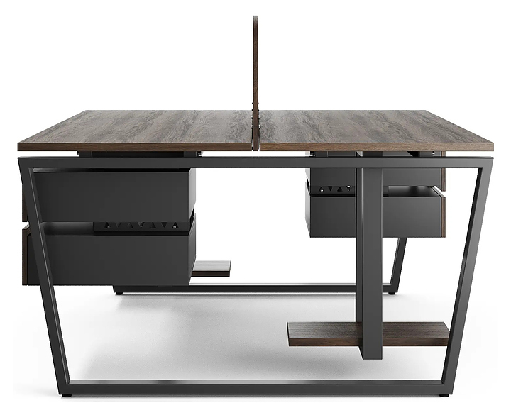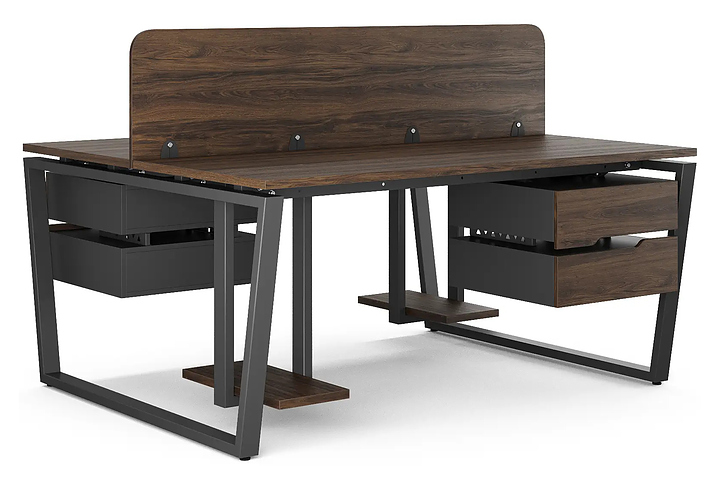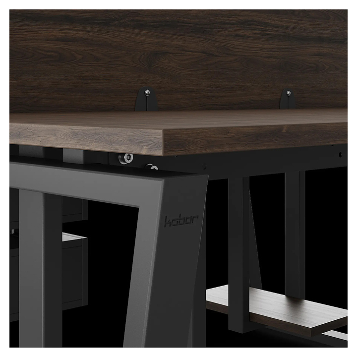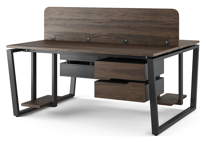 Офисный стол Кобор OTR/2-140/120 black/charlston на 2 рабочих места используется в офисных помещениях и кабинетах руководителей. Модель оснащена опорами в форме обратной трапеции. Каркас и опоры выполнены из металла, выкрашенного в цвет черный муар (RAL9005), столешница – из ламинированной древесно-стружечной плиты (ЛДСП) цвета дуб чарльстон (H3154 ST36). Дополнительные характеристики: