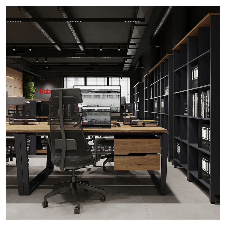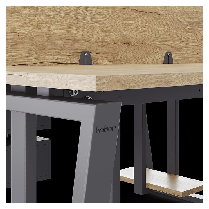 Офисный стол Кобор OTR/2-140/120 graphite/natural на 2 рабочих места используется в офисных помещениях и кабинетах руководителей. Модель оснащена опорами в форме обратной трапеции. Каркас и опоры выполнены из металла, выкрашенного в цвет графит муар (RAL7024), столешница – из ламинированной древесно-стружечной плиты (ЛДСП) цвета натуральный дуб (H1180 ST37). Дополнительные характеристики: