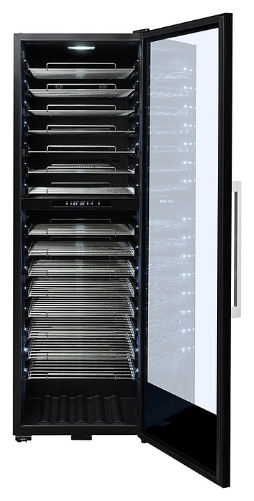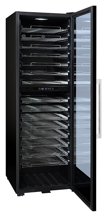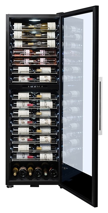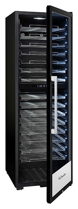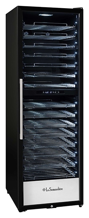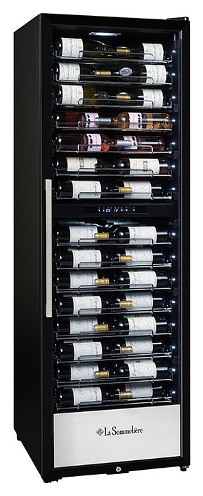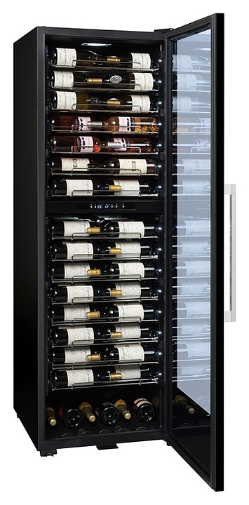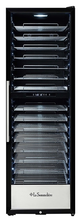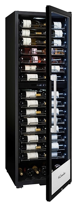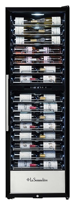 Винный шкаф La Sommeliere PRO160DZN предназначен для хранения при оптимальных условиях и демонстрации бутилированного вина различных сортов в барах, ресторанах, специализированных магазинах, складских помещениях, а также домашних условиях. Модель оснащена холодильной камерой с 2 независимыми температурными зонами, правосторонней перенавешиваемой распашной дверью на внешних петлях, вертикальной рукояткой, обзорным остеклением, кабелем питания с вилкой, расположенной внутри камеры панелью управления с сенсорными клавишами, светодиодными лампами и цифровым дисплеем с белой подсветкой индикации. Корпус выполнен из металла с антикоррозийным покрытием черного цвета, рукоятка – из металла с сатинированной серебристой поверхностью, внутренняя облицовка камеры черного цвета, полки – из стали. В комплект поставки входят 15 выдвижных решетчатых полок для размещения бутылок, крепеж для рукоятки, ключ от замка, инструкция по эксплуатации, гарантийный талон и заводская упаковка. Особенности: