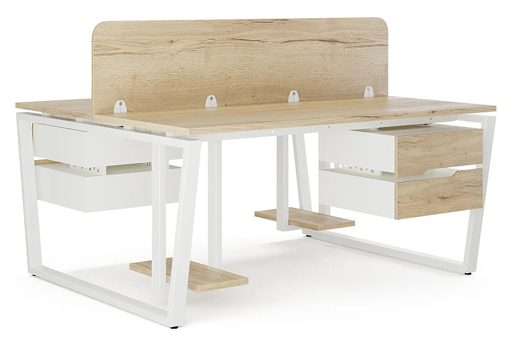 Офисный стол Кобор OTR/2-140/160 white/natural на 2 рабочих места используется в офисных помещениях и кабинетах руководителей. Модель оснащена опорами в форме обратной трапеции. Каркас и опоры выполнены из металла, выкрашенного в цвет белый муар (RAL9016), столешница – из ламинированной древесно-стружечной плиты (ЛДСП) цвета натуральный дуб (H1180 ST37). Дополнительные характеристики: