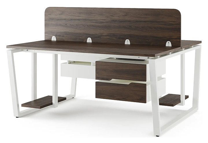 Офисный стол Кобор OTR/2-160/120 white/charlston на 2 рабочих места используется в офисных помещениях и кабинетах руководителей. Модель оснащена опорами в форме обратной трапеции. Каркас и опоры выполнены из металла, выкрашенного в цвет белый муар (RAL9016), столешница – из ламинированной древесно-стружечной плиты (ЛДСП) цвета дуб чарльстон (H3154 ST36). Дополнительные характеристики: