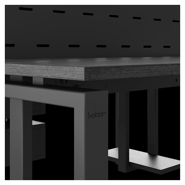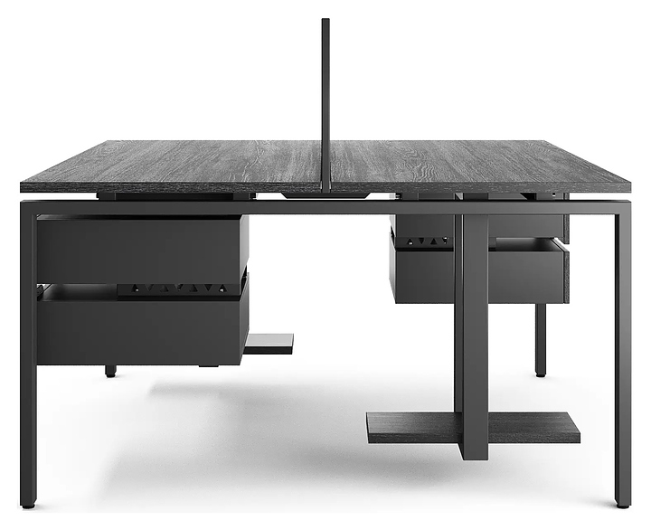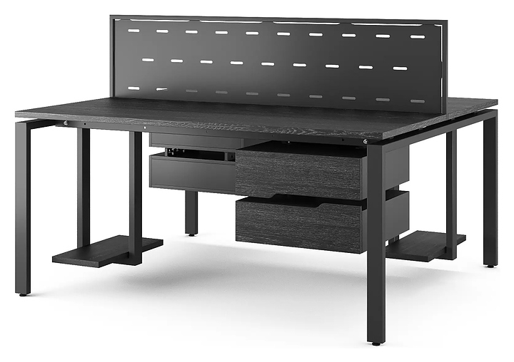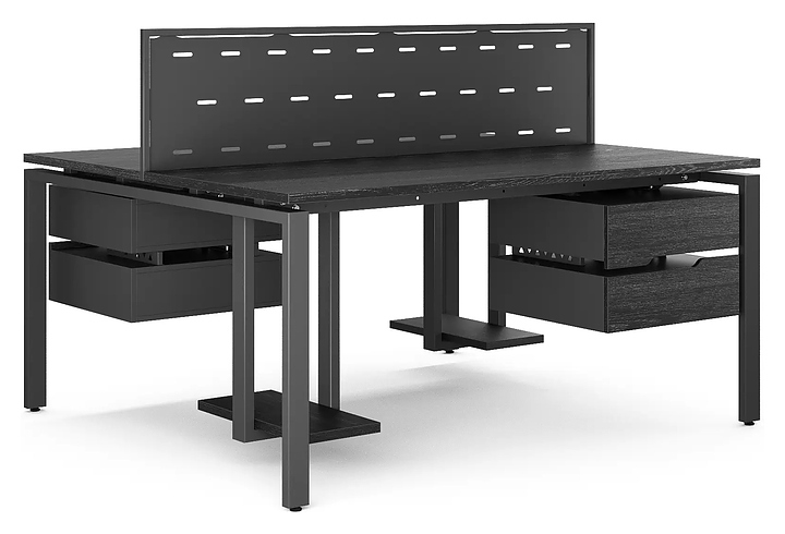 Офисный стол Кобор P/2-140/140 black/glazed на 2 рабочих места используется в офисных помещениях и кабинетах руководителей. Модель оснащена П-образными опорами. Каркас и опоры выполнены из металла, выкрашенного в цвет черный муар (RAL9005), столешница – из ламинированной древесно-стружечной плиты (ЛДСП) цвета черный дуб (H3178 ST37). Дополнительные характеристики: