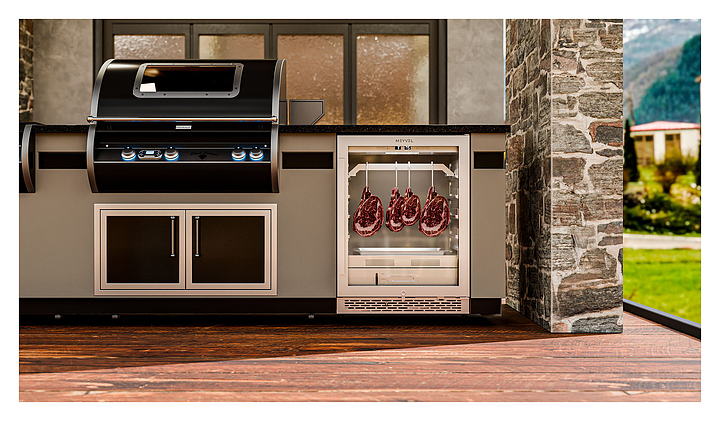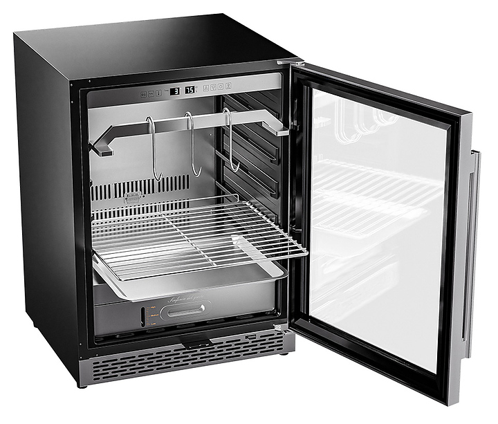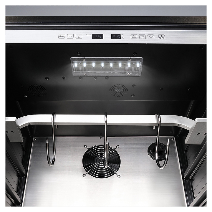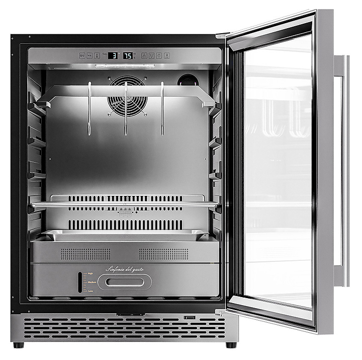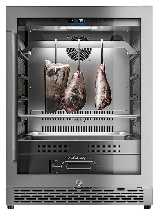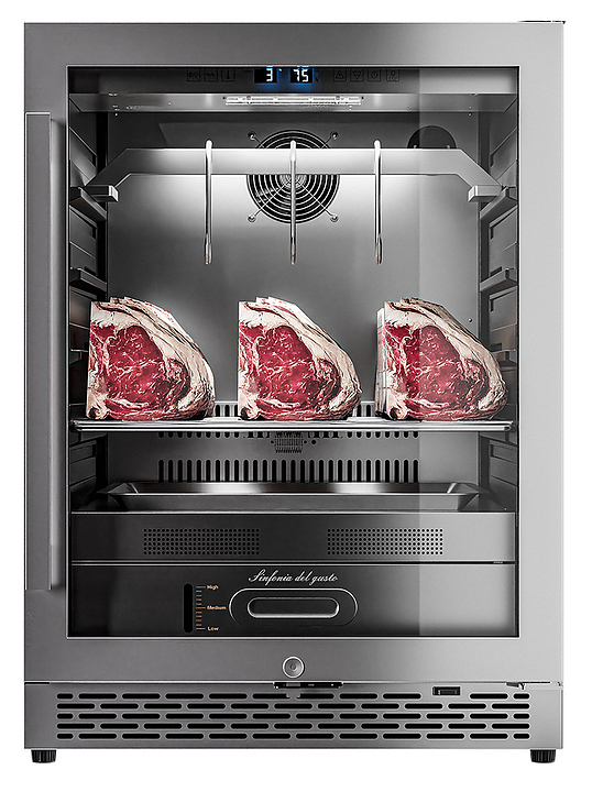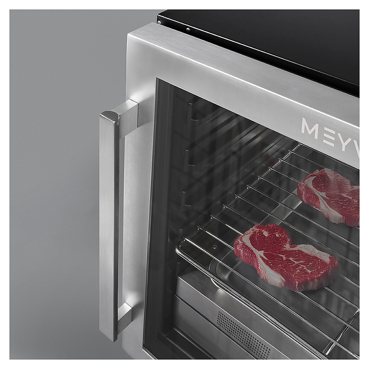 Шкаф MEYVEL MM-45SR предназначен для охлаждения и вызревания мяса, птицы, колбасы, рыбы, ветчины, сыра и салями на предприятиях общественного питания и в домашних услових. Модель обеспечивает условия, способствующие разрушению волокон мяса под воздействием ферментативных реакций и холодного воздуха, что приводит к улучшению текстуры и вкуса. Шкаф оснащен сенсорным управлением, демонстрационным освещением, ручкой и регулируемыми ножками. Угольный фильтр очищает воздух внутри шкафа от посторонних запахов. Корпус и ручка выполнены из стали, рамка двери - из бесшовной нержавеющей стали, дверца - из тройного стекла с УФ-фильтром, решетки - из хромированного металла. Особенности: