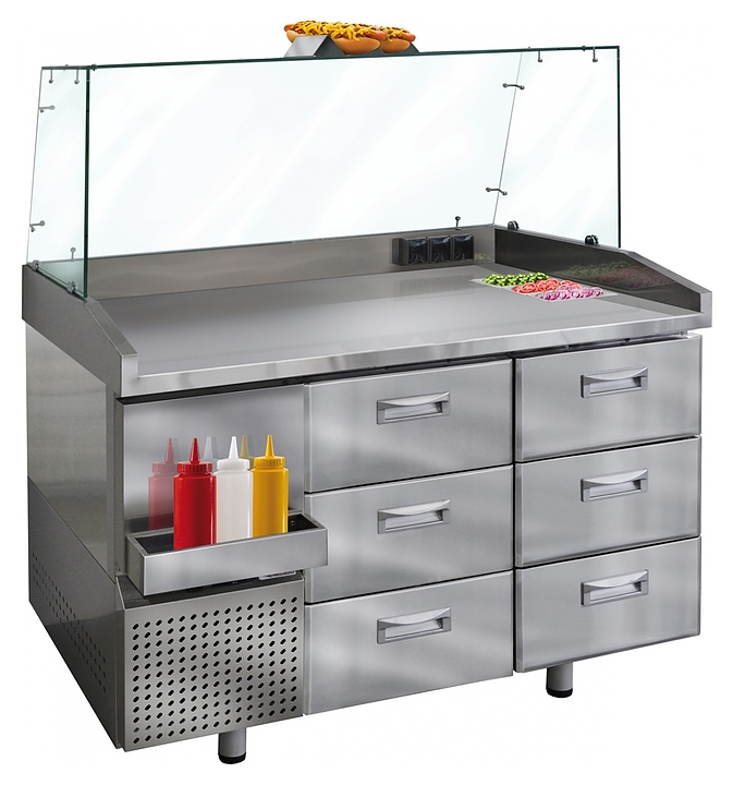Станция Finist СХ-800-0/6 предназначена кратковременного хранения и обработки ингредиентов, размещения технологического оборудования для приготовления хот-догов на предприятиях общественного питания и торговли. Модель оснащена встроенным агрегатом слева, холодильной камерой с 2 секциями по 3 выдвижных ящика в каждой, столешницей повышенной прочности с охлаждаемым холдером под гастроемкости, прозрачным защитным экраном, 3 розетками, подставкой под 4 стандартные бутылки с соусами, подставкой под готовые хот-доги, устойчивыми опорами с подпятниками, кабелем питания с евровилкой и панелью управления. Корпус выполнен из высококачественной нержавеющей стали. Особенности: