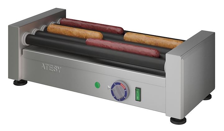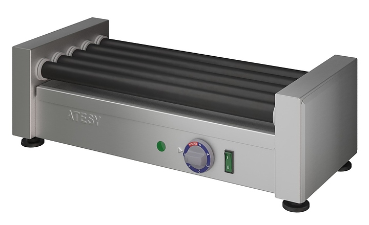 Роликовый гриль ATESY Комбат ГР-5Р-450-02-А используется на предприятиях общественного питания и торговли для обжаривания сосисок, сарделек, а также мясных и рыбных батончиков цилиндрической формы. Модель оснащена терморегулятором и индикаторной лампой. Корпус выполнен из нержавеющей стали, ролики - из черной нержавеющей стали с антипригарным покрытием. Особенности: