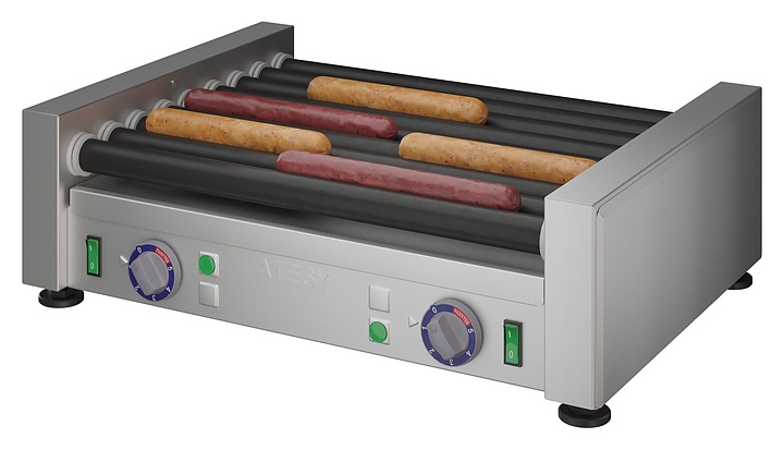 Роликовый гриль ATESY Комбат ГР-9Р-450-02-А используется на предприятиях общественного питания и торговли для обжаривания сосисок, сарделек, а также мясных и рыбных батончиков цилиндрической формы. Модель оснащена терморегулятором и индикаторной лампой. Корпус выполнен из нержавеющей стали, ролики - из черной стали с антипригарным покрытием. Особенности: