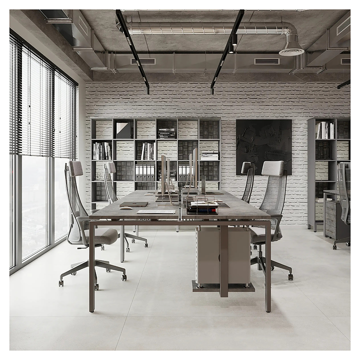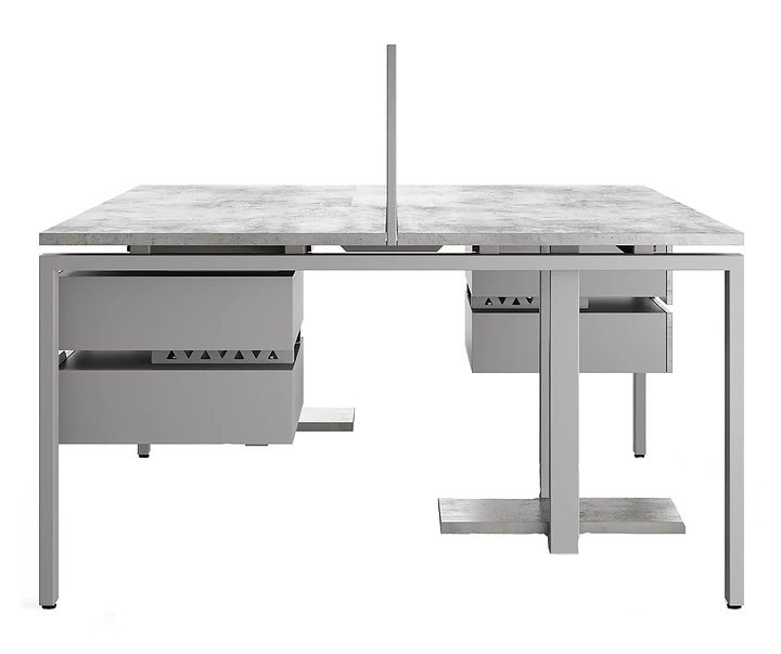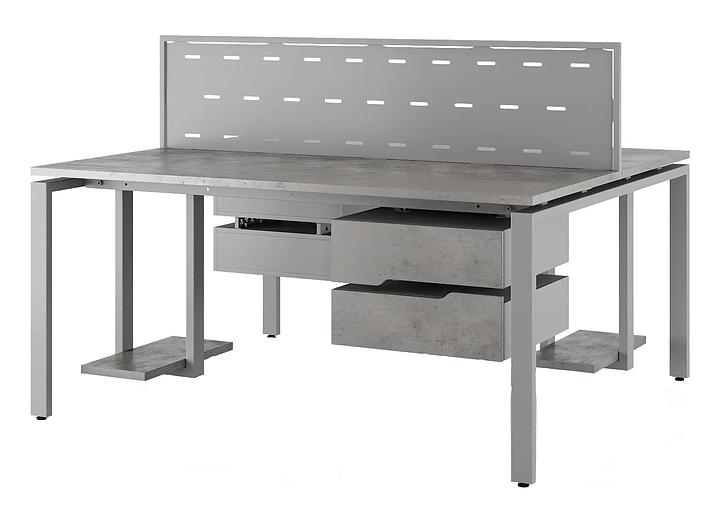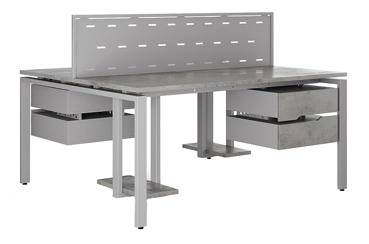 Офисный стол Кобор P/2-180/120 aluminum/chicago на 2 рабочих места используется в офисных помещениях и кабинетах руководителей. Модель оснащена П-образными опорами. Каркас и опоры выполнены из металла, выкрашенного в цвет алюминиевый металлик (RAL9006), столешница из ламинированной древесно-стружечной плиты (ЛДСП) цвета бетон чикаго (F186 ST9). Дополнительные характеристики: