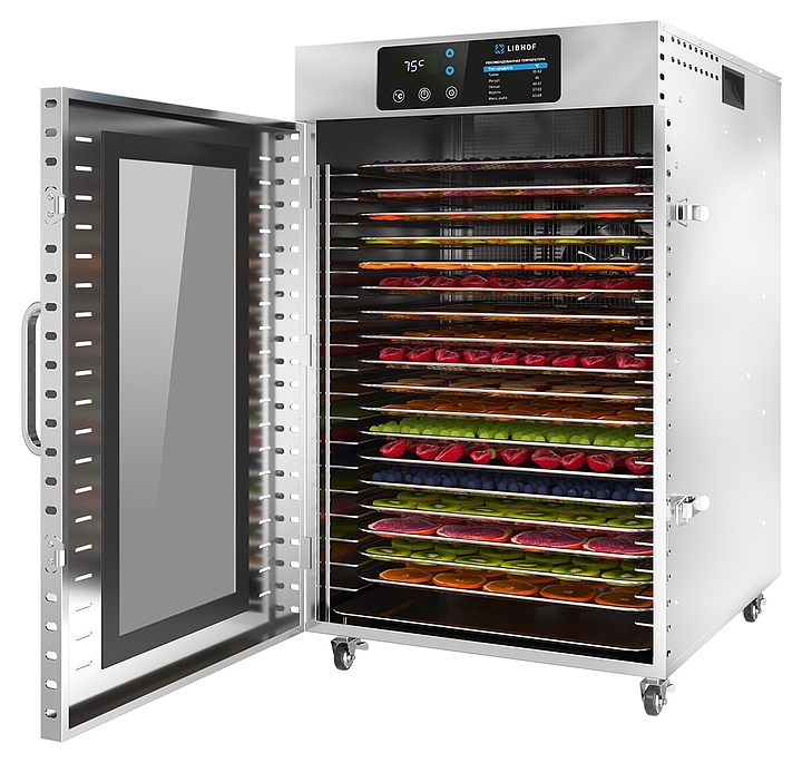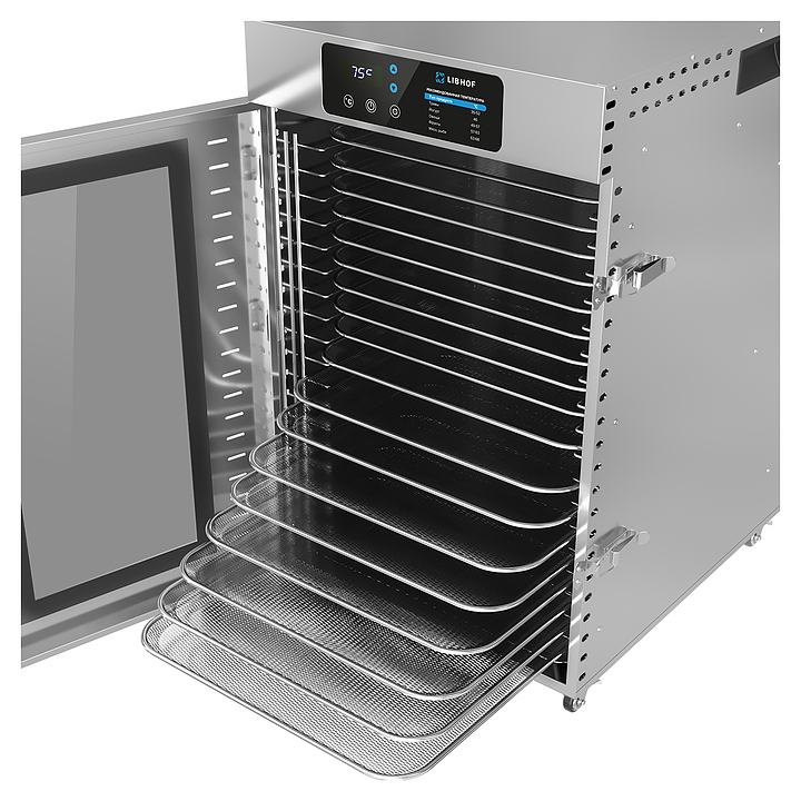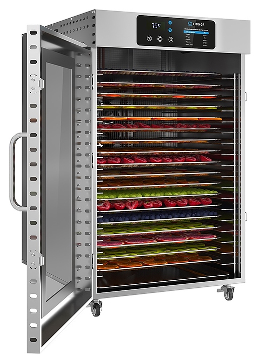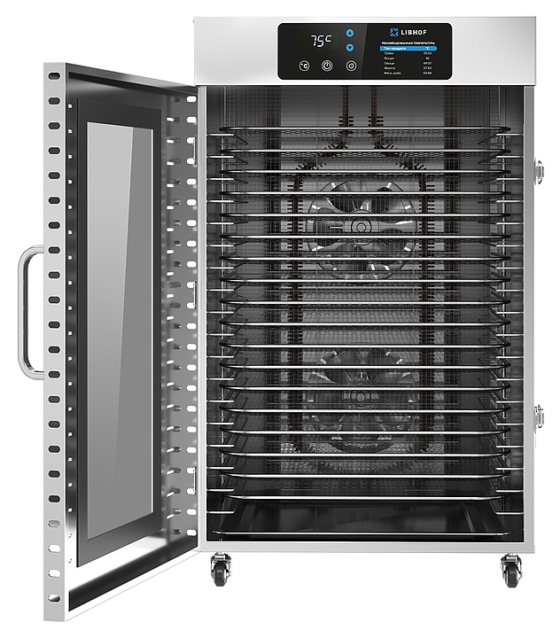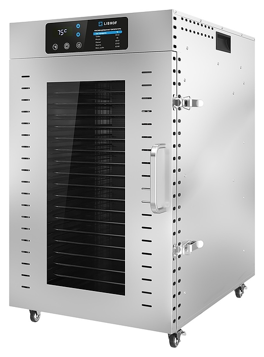 Дегидратор Libhof FDT-18 используется для сушки овощей, фруктов, ягод, грибов и трав, а также вяления рыбы, расстойки теста, приготовления сухариков, пастилы и йогурта на предприятиях пищевой промышленности, общественного питания и торговли. Модель оснащена камерой с 18 уровнями направляющих для размещения поддонов, расположенными в задней стенке 2 вентиляторами и нагревательными элементами, левосторонней распашной дверью с вертикальной рукояткой, обзорным остеклением, кабелем питания, расположенным на верхней фронтальной панели блоком управления с сенсорной клавиатурой и светодиодным цифровым дисплеем. Корпус, решетчатые и сетчатые поддоны выполнены из высококачественной нержавеющей стали, лотки для пастилы – из силикона. В комплект поставки входят 10 съемных решетчатых поддонов, 4 поддона с мелкоячеистой сеткой для трав и ягод, 6 лотков для пастилы, инструкция по эксплуатации и гарантийный талон. Особенности: