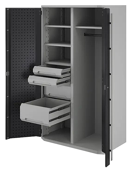 Шкаф Кобор Expert MC/3-100/60 4S.22B предназначен для хранения оснастки, приспособлений и инструмента на рабочих местах в мастерских, цехах и других производственных зонах. Модель оснащена 2 распашными дверьми с внутренней перфорацией для навешивания крючков и держателей, 4 полками, 4 ящиками, штангой для вешалок и ригельным замком. Встроенная вертикальная перегородка делит шкаф на 2 изолированных отсека, что особенно удобно для совместного использования несколькими сотрудниками или разделения видов оснастки. Корпус выполнен из листовой стали с порошковой краской, которая отличается высокой устойчивостью к истиранию, влаге, моющим и смазочным веществам. Внимание! Информация о товарах, размещенная на сайте, не является публичной офертой, определяемой положениями Части 2 Статьи 437 Гражданского кодекса Российской Федерации. Производители вправе вносить изменения в технические характеристики, внешний вид и комплектацию товаров без предварительного уведомления. Уточняйте характеристики у наших менеджеров перед оформлением заказа. |